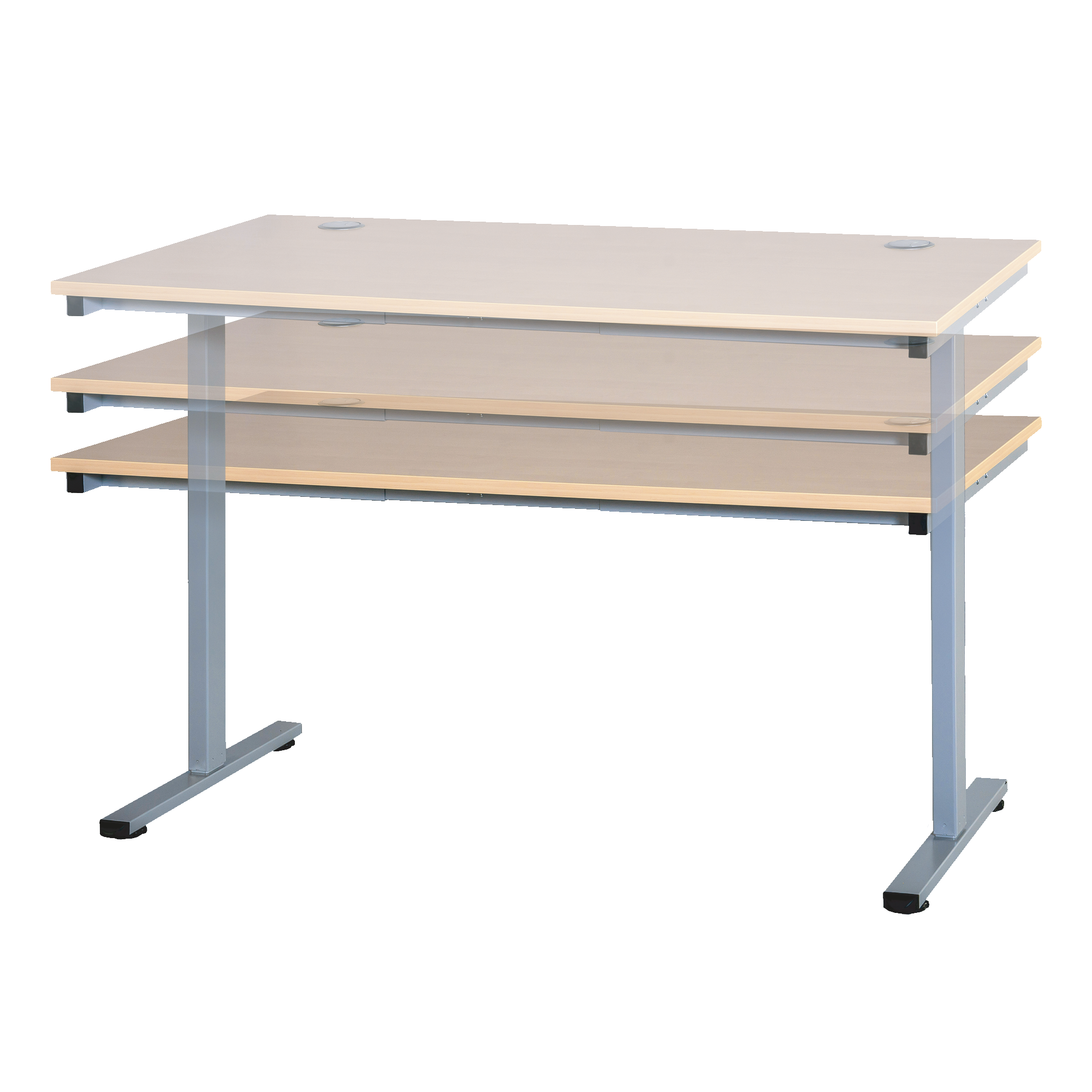 Unsere elektrisch höhenverstellbaren Schreibtische können als kombinierte ergonomische Steh- und Sitzarbeitsplätze genutzt werden. Die elektrische Höhenverstellung arbeitet sanft und bietet einen Einstellbereich von 50 cm Hub. Mittels unter dem Schreibtisch angebrachter Tasten kann der elektrisch höhenverstellbare Schreibtisch an die gewünschte Arbeitshöhe angepasst werden. Für Geräteanschlüsse und Geräteverbindungen sind in der Tischplatte 2 Kabeldurchlässe vorgesehen.