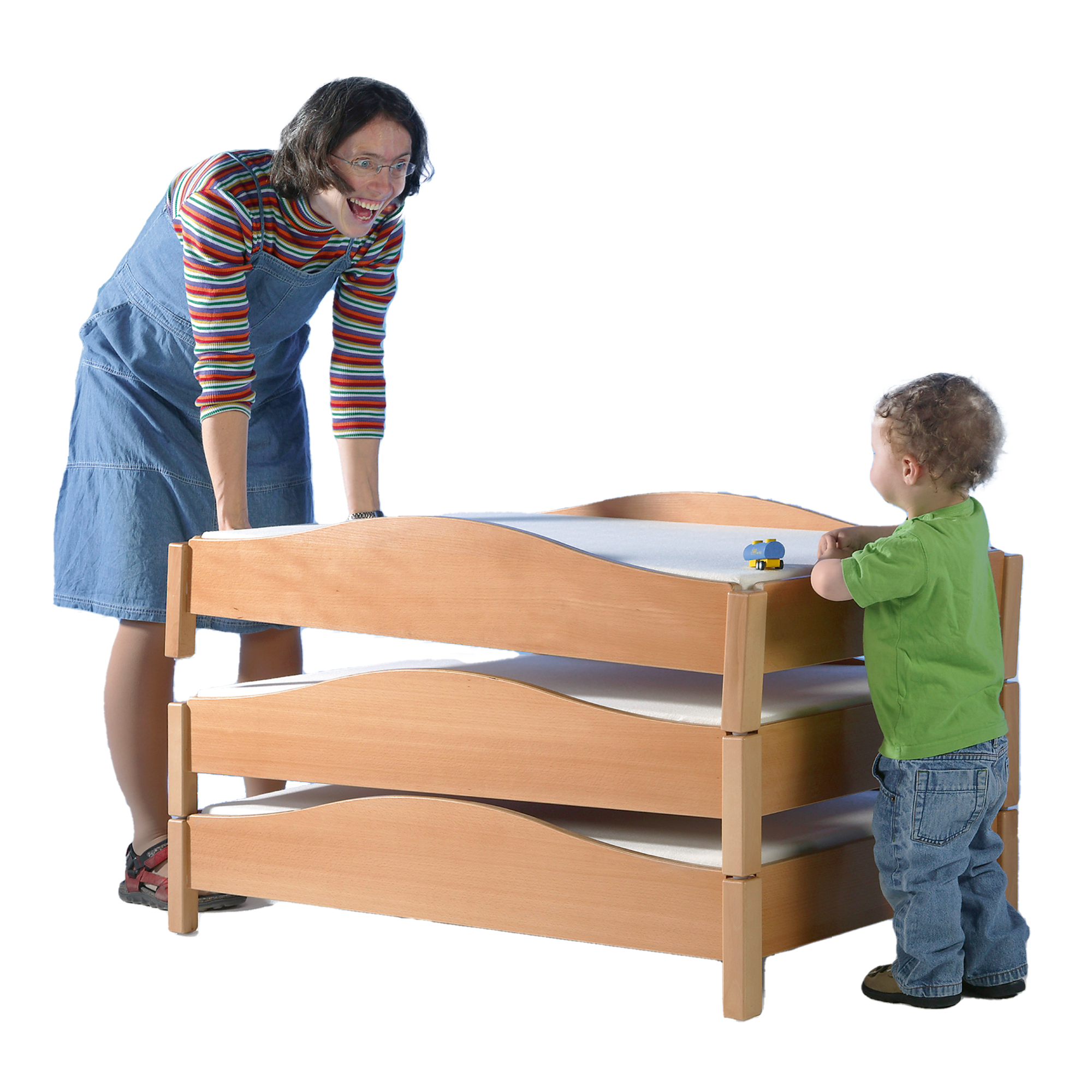 Stapelbare Betten erleichtern das Handling in Schlafräumen. Die Kleinsten finden in Betten mit den Maßen (B/B/T) 124x27x64 ihre Ruhe. Die geschwungenen Seitenteile auf stabilem Birke-Muliplexmaterial schützen die Kinder vor dem Herausrollen. Die konstruktive Anordnung der Beine ermöglicht die Stapelfähigkeit. Die Stapelhöhe weiterer Betten jeweils 20 cm. Die Lieferung der 8 cm hohen Matraze ist im Lieferumfang enthalten. Die Matraze ruht auf federnden Leisten, die zugleich die hygienisch erforderliche Unterlüftung der Matraze sicherstellen.