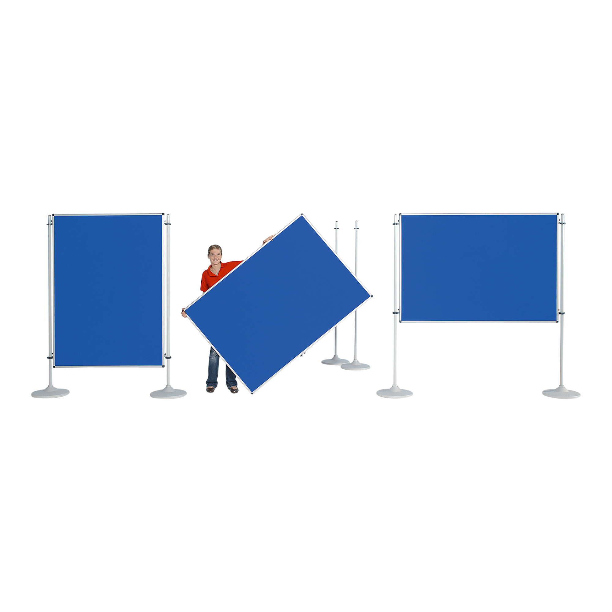 Das Set enthält zwei Tafeln im Format 170x120 cm (Modell NSTT-F40608), die beidseitig nutzbar sind. Jede Tafel bietet eine orange und eine blaue Seite, sodass Sie je nach Bedarf die passende Farbe wählen können. Drei stabile T-Fuß-Stative (SVT 5) sorgen für sicheren Halt und ermöglichen einen flexiblen Einsatz der Tafeln.