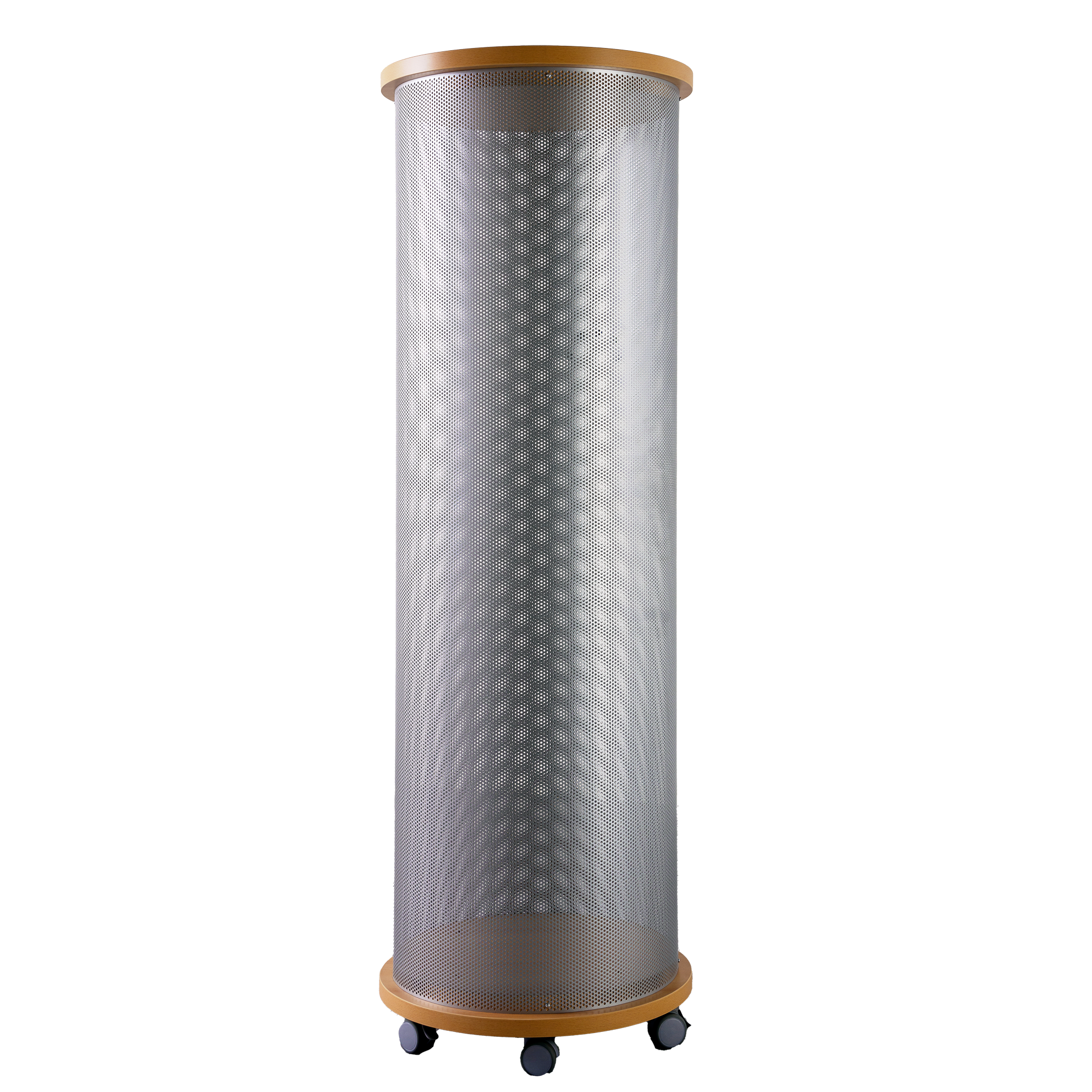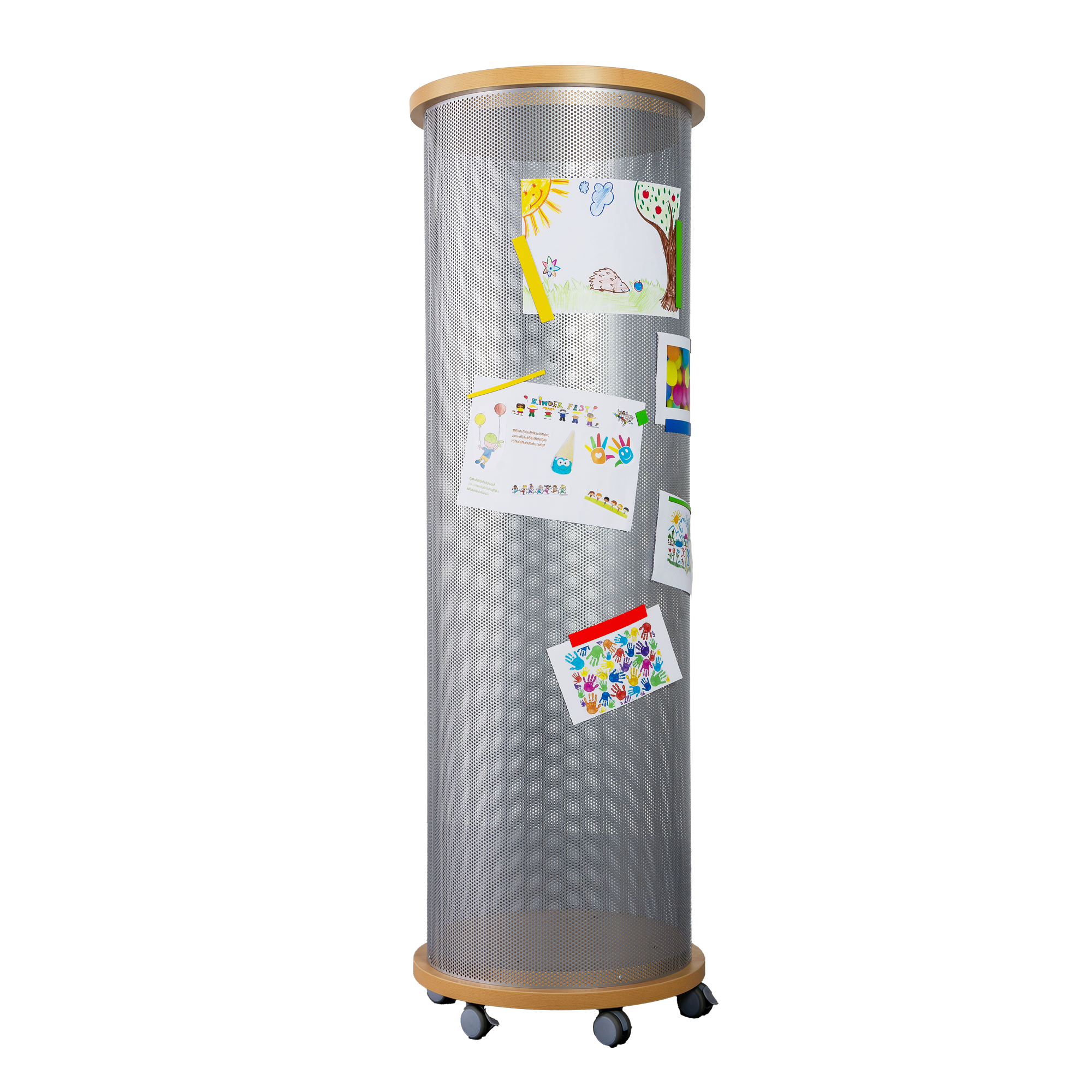 Die runde Litfaßsäule in feuerhemmender Ausführung hat eine Lochblechwandung. Für das Lochblech unserer Infosäulen stehen verschieden RAL- Farben zur Auswahl. Die runden Deckel- und Bodenplatten der Lochblechsäule haben einen Durchmesser von 70 cm und sind 3,8 cm stark, die B1-Ausführung gibt das Dekor Buche-hell vor. Durch 5 Rollen, davon 2 feststellbar, lässt sich die Säule leicht verfahren.