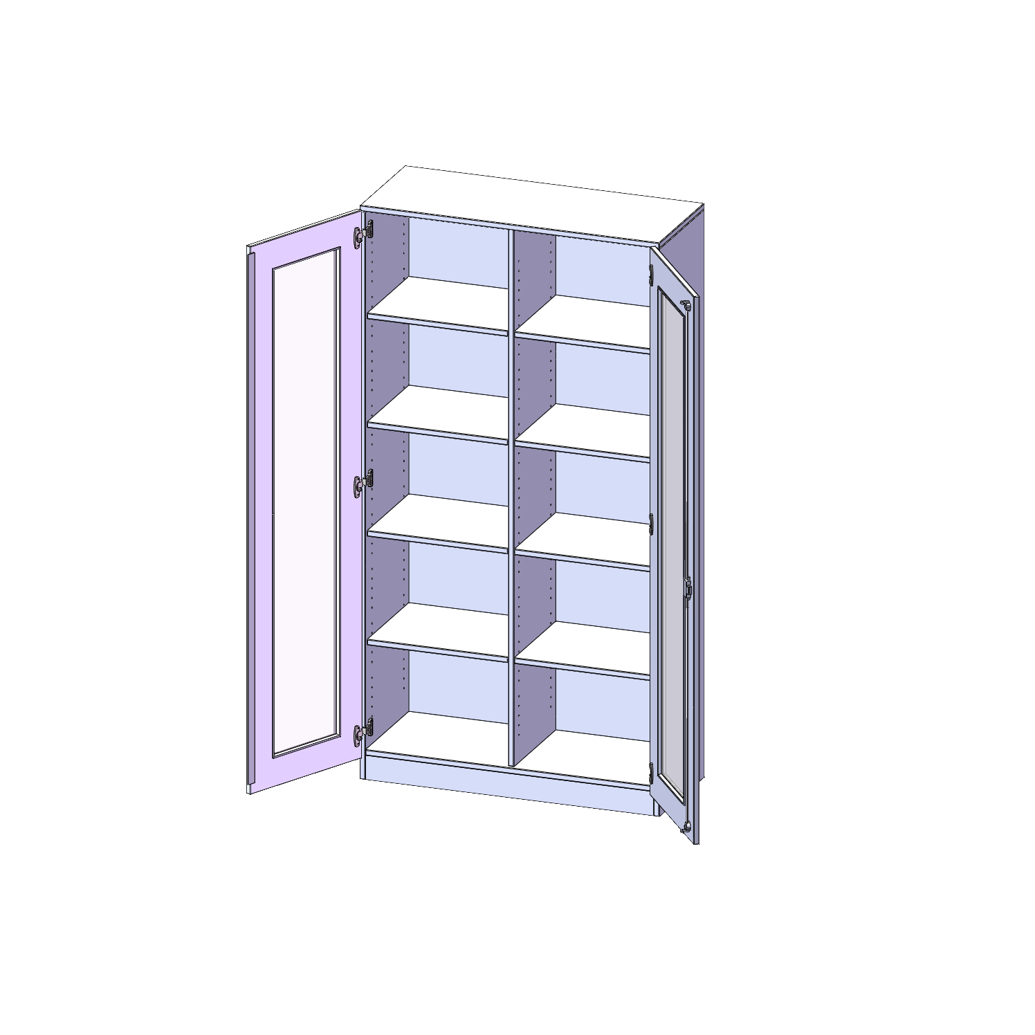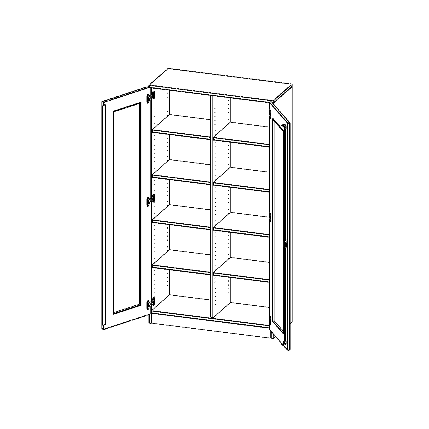 Die Türen öffnen 270°, sind abschließbar und mit einem Glasausschnitt versehen. Die Glaseinlage besteht aus Sicherheitsgründen aus Acrylglas, ist von innen eingesetzt und auf der Tür von innen verschraubt. So sehen Sie schnell, was im Schrank untergebracht ist. Besonders praktisch für Sammlungen.