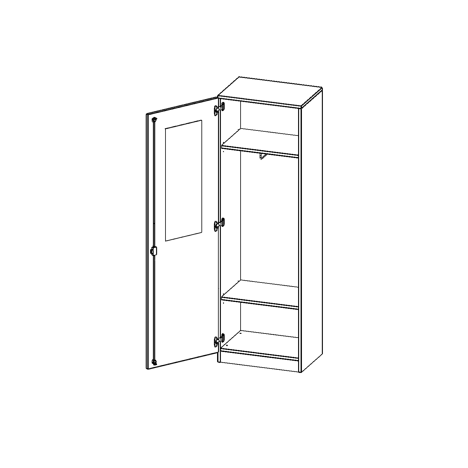Auf der Innenseite einer der Türen befindet sich ein flächig aufgeklebter Spiegel (splitterbindende Folie). Weiterhin befinden sich im Schrank 2 Einlegeböden (Hut- und Schuhablage) sowie eine Kleiderstange.