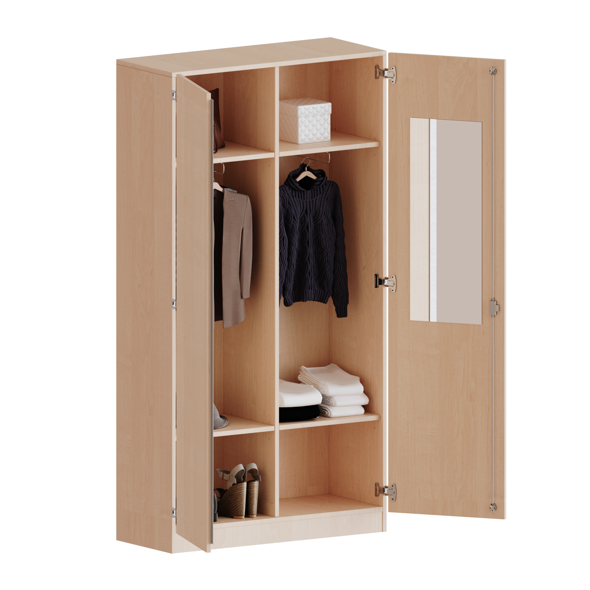 Auf der Innenseite einer der Türen befindet sich ein flächig aufgeklebter Spiegel (splitterbindende Folie). Weiterhin befinden sich im Schrank 2 Einlegeböden (Hut- und Schuhablage) sowie eine Kleiderstange.