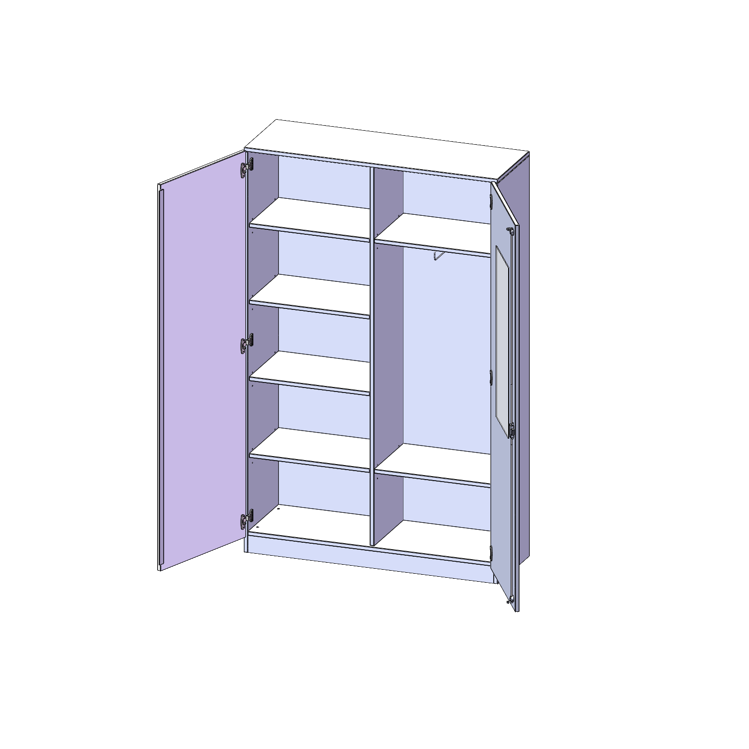 Auf der Innenseite einer der Türen befindet sich ein flächig aufgeklebter Spiegel (splitterbindende Folie). Weiterhin befinden sich im Schrank 2 Einlegeböden (Hut- und Schuhablage) sowie eine Kleiderstange.