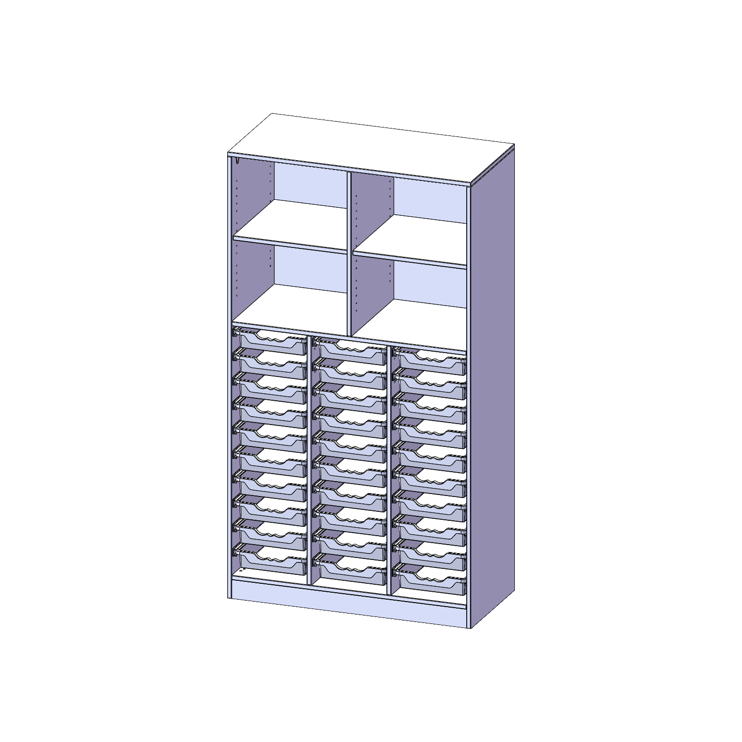 B/H/T: 104,5x190x50 cm, mit Sockel (81 mm), unten 30 flache ErgoTray Boxen, oben 2 Einlegeböden