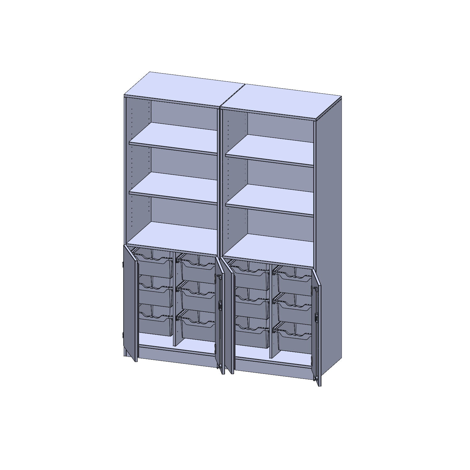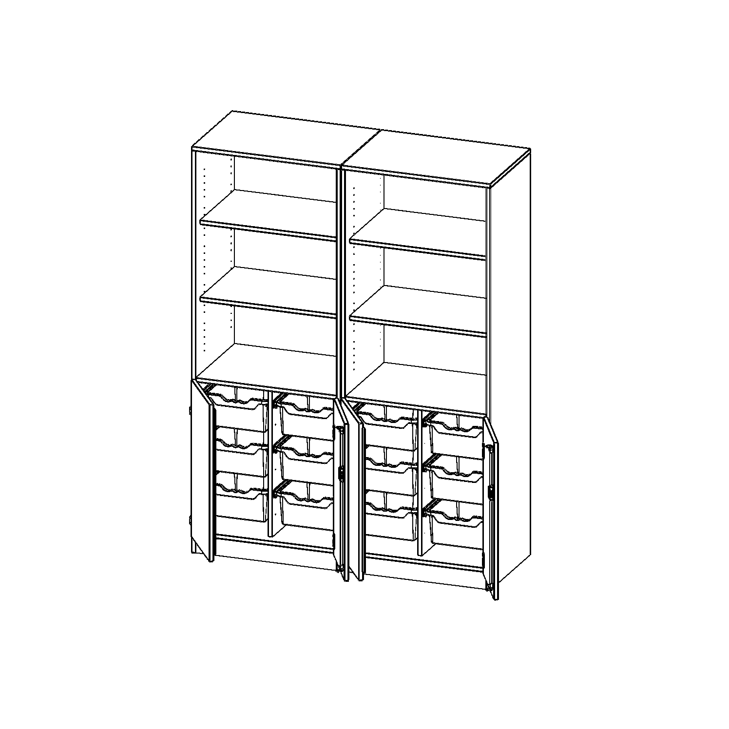 B/H/T: 140,6x190x50 cm, unten 2 OH Türen und 12 hohe ErgoTray Boxen, oben 3 OH Regal, mit Sockel (81 mm), mit Mittelwand