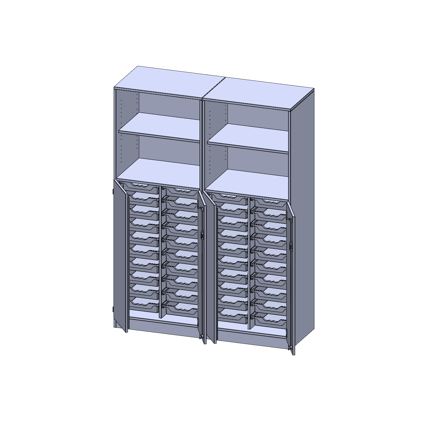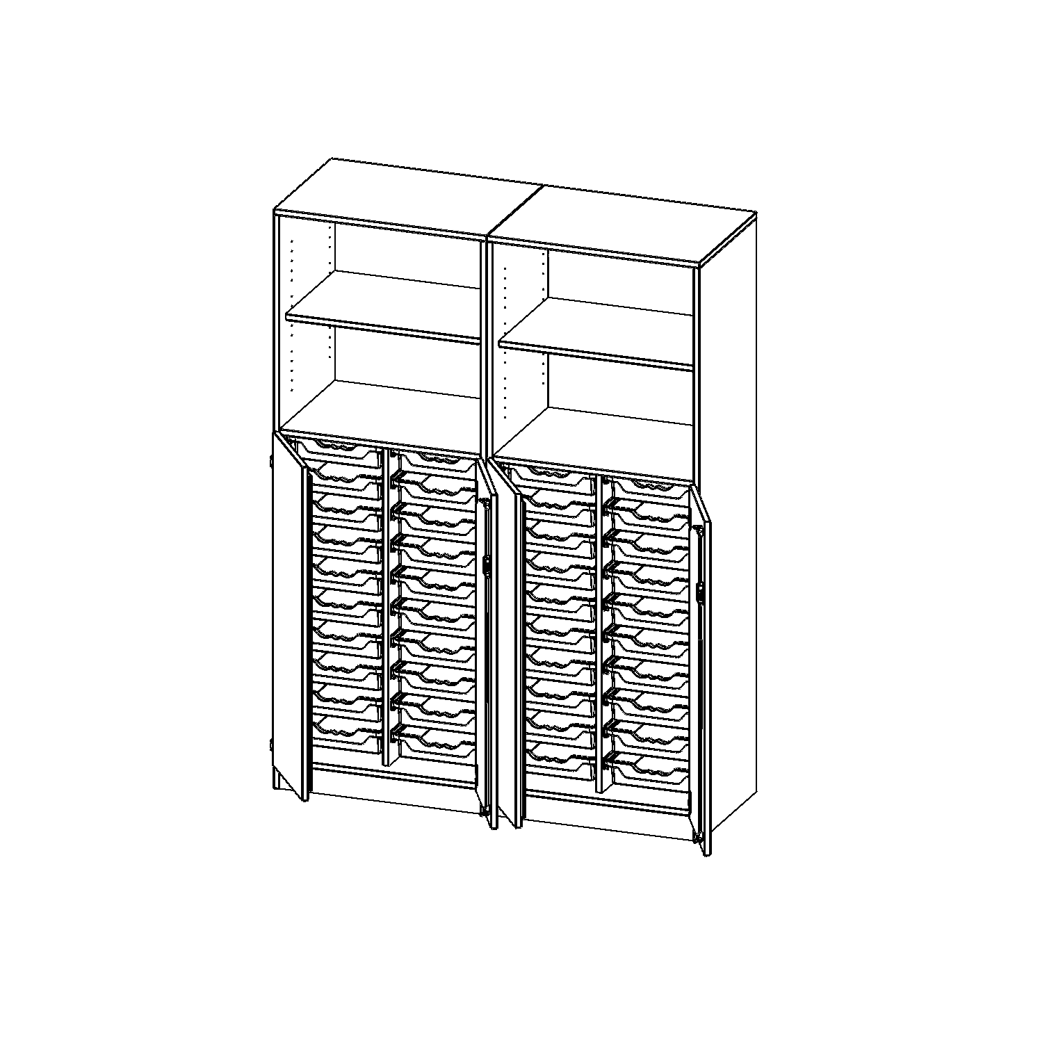 B/H/T: 140,6x190x50 cm, unten 3 OH Türen und 40 flache ErgoTray Boxen, oben 2 OH Regal, mit Sockel (81 mm), mit Mittelwand