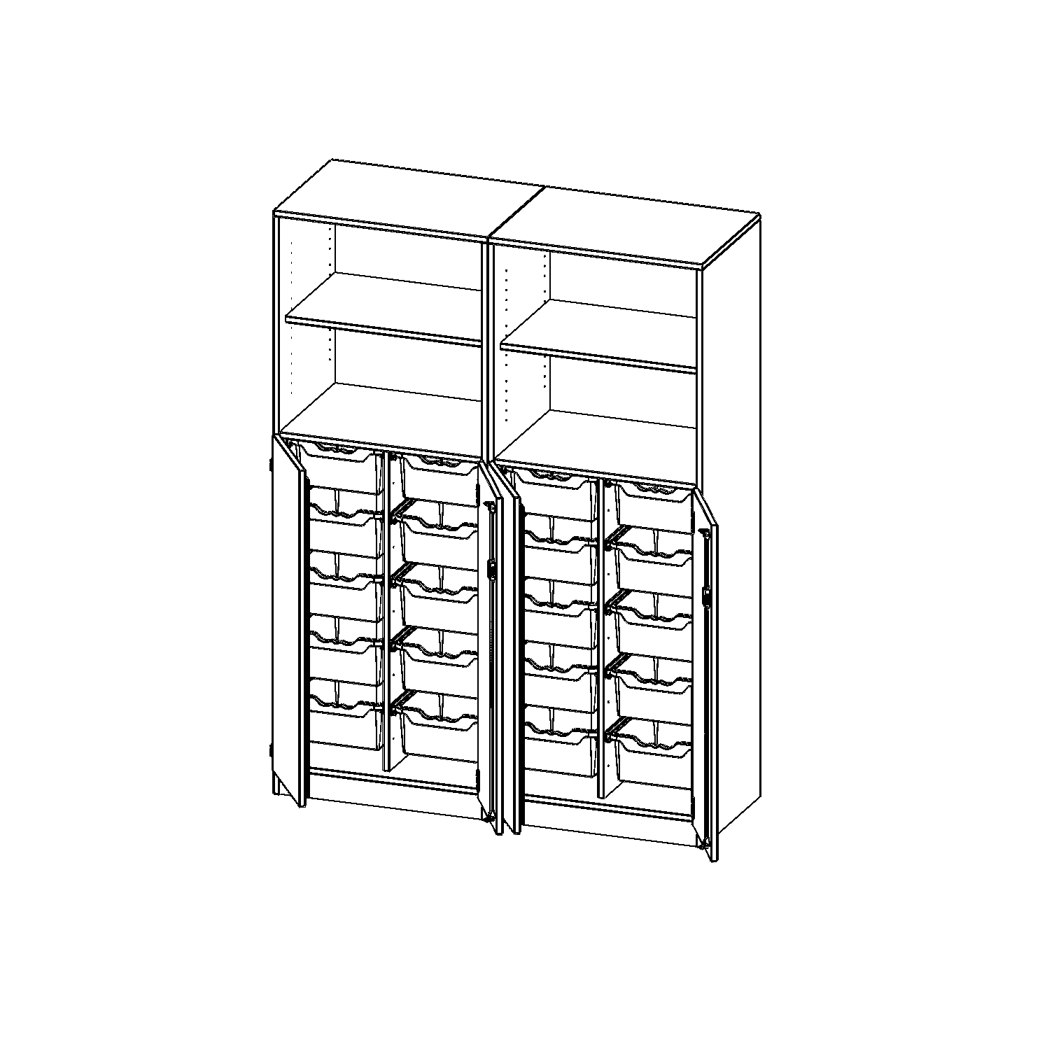 B/H/T: 140,6x190x50 cm, unten 3 OH Türen und 20 hohe ErgoTray Boxen, oben 2 OH Regal, mit Sockel (81 mm), mit Mittelwand