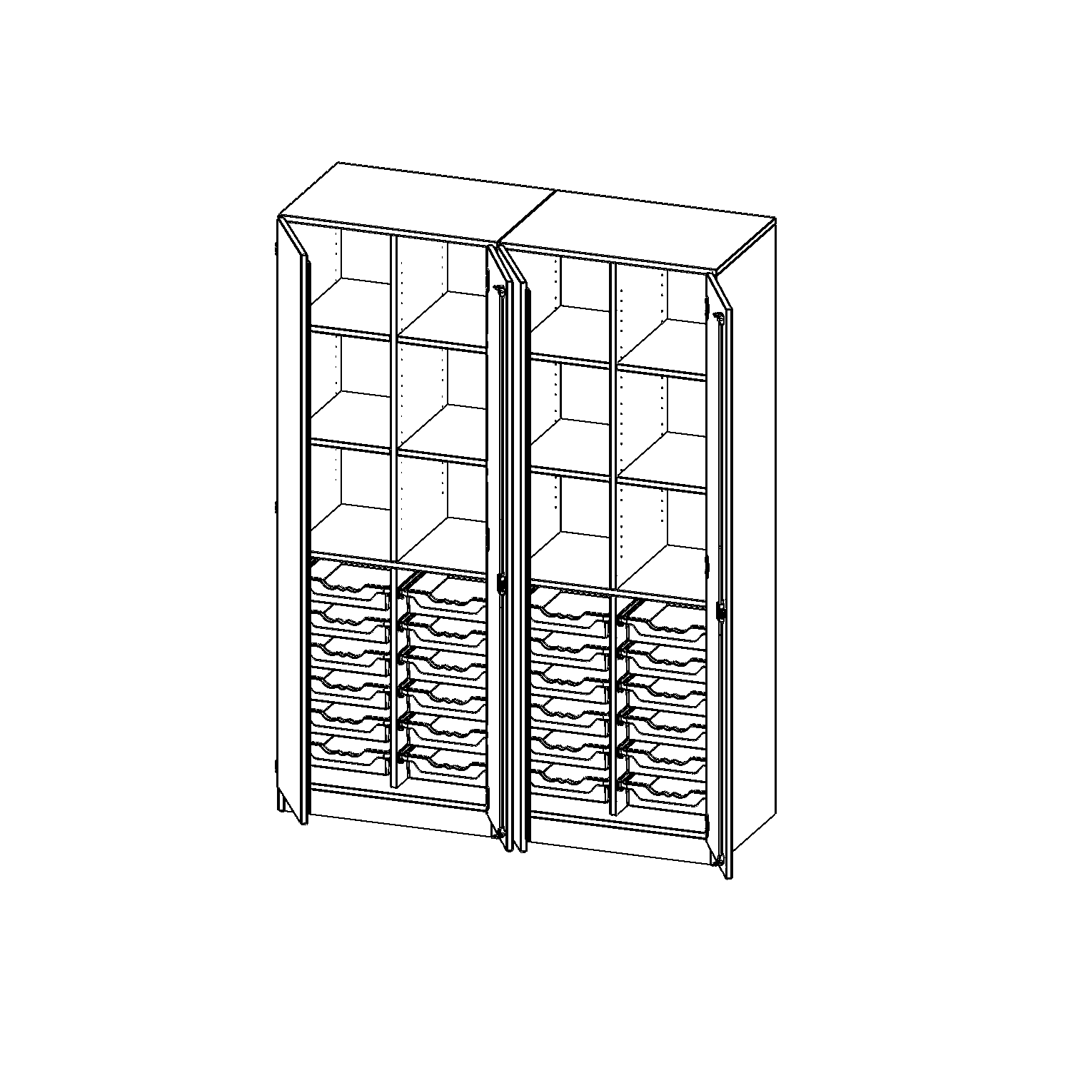 B/H/T: 140,6x190x50 cm, viertürig, zweiteilig, mit Sockel (81 mm), mit 2 Mittelwänden, mit 24 flachen ErgoTray Boxen