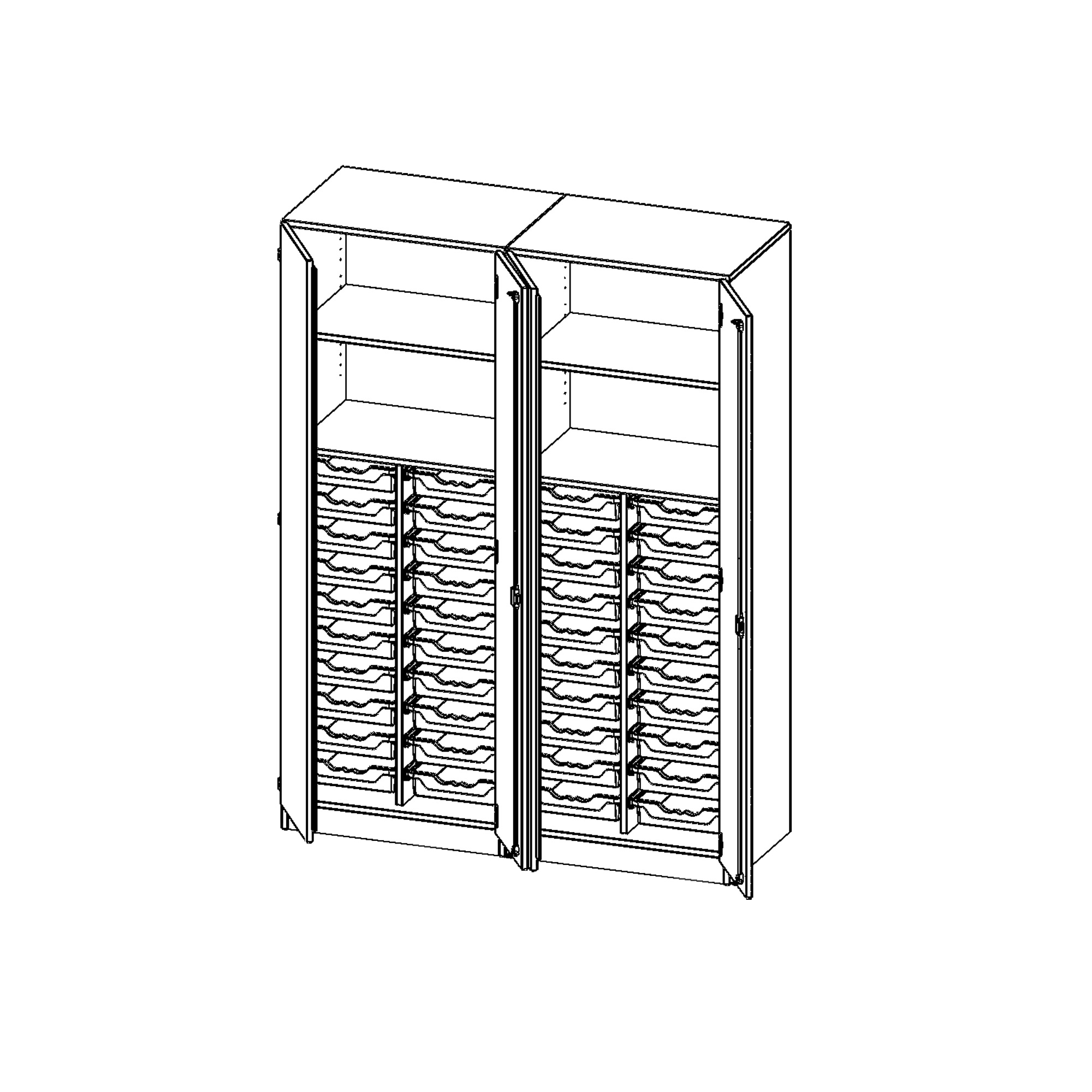 B/H/T: 140,6x190x50 cm, viertürig, zweiteilig, mit Sockel (81 mm), mit Mittelwand, mit 40 flachen ErgoTray Boxen