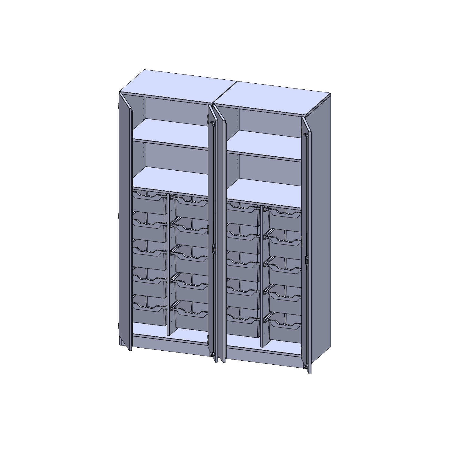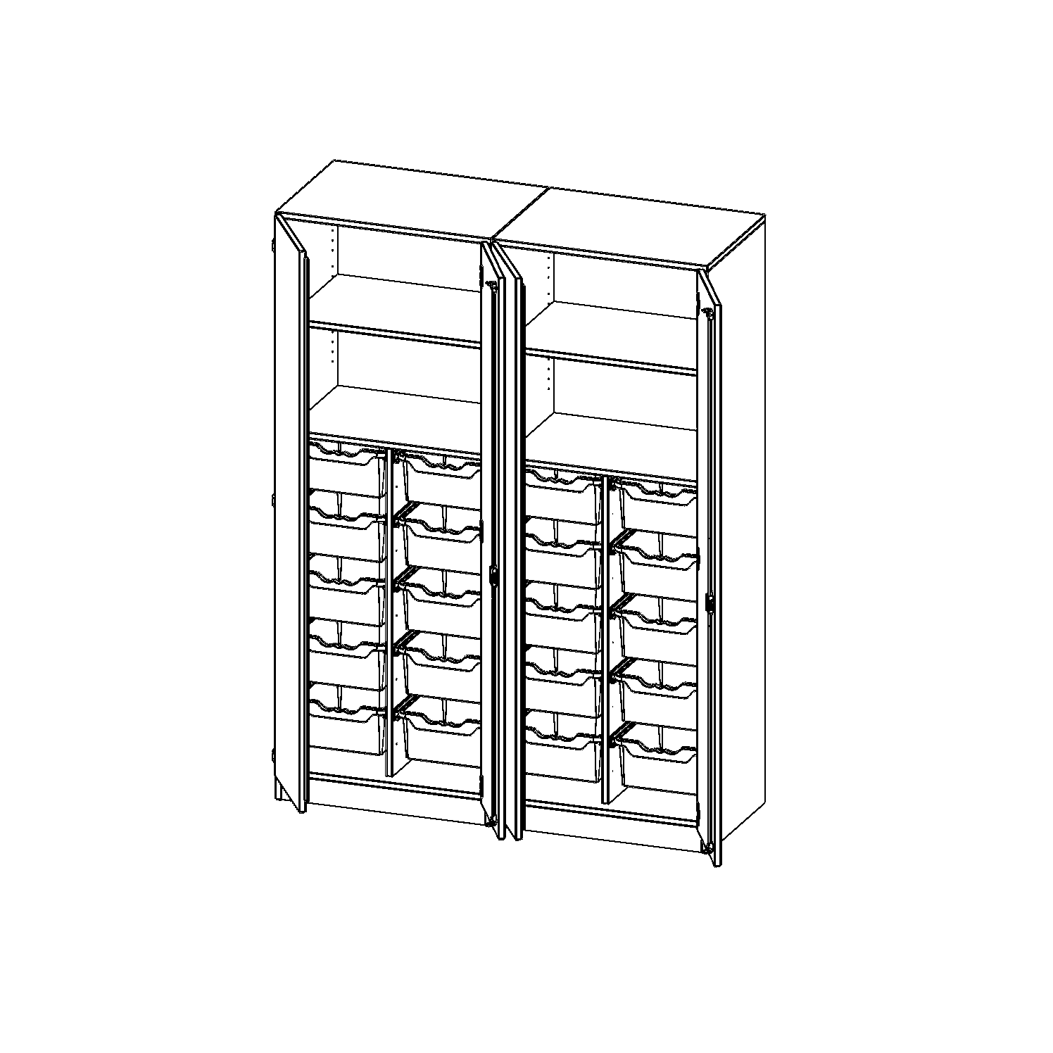 B/H/T: 140,6x190x50 cm, viertürig, zweiteilig, mit Sockel (81 mm), mit Mittelwand, mit 20 hohen ErgoTray Boxen