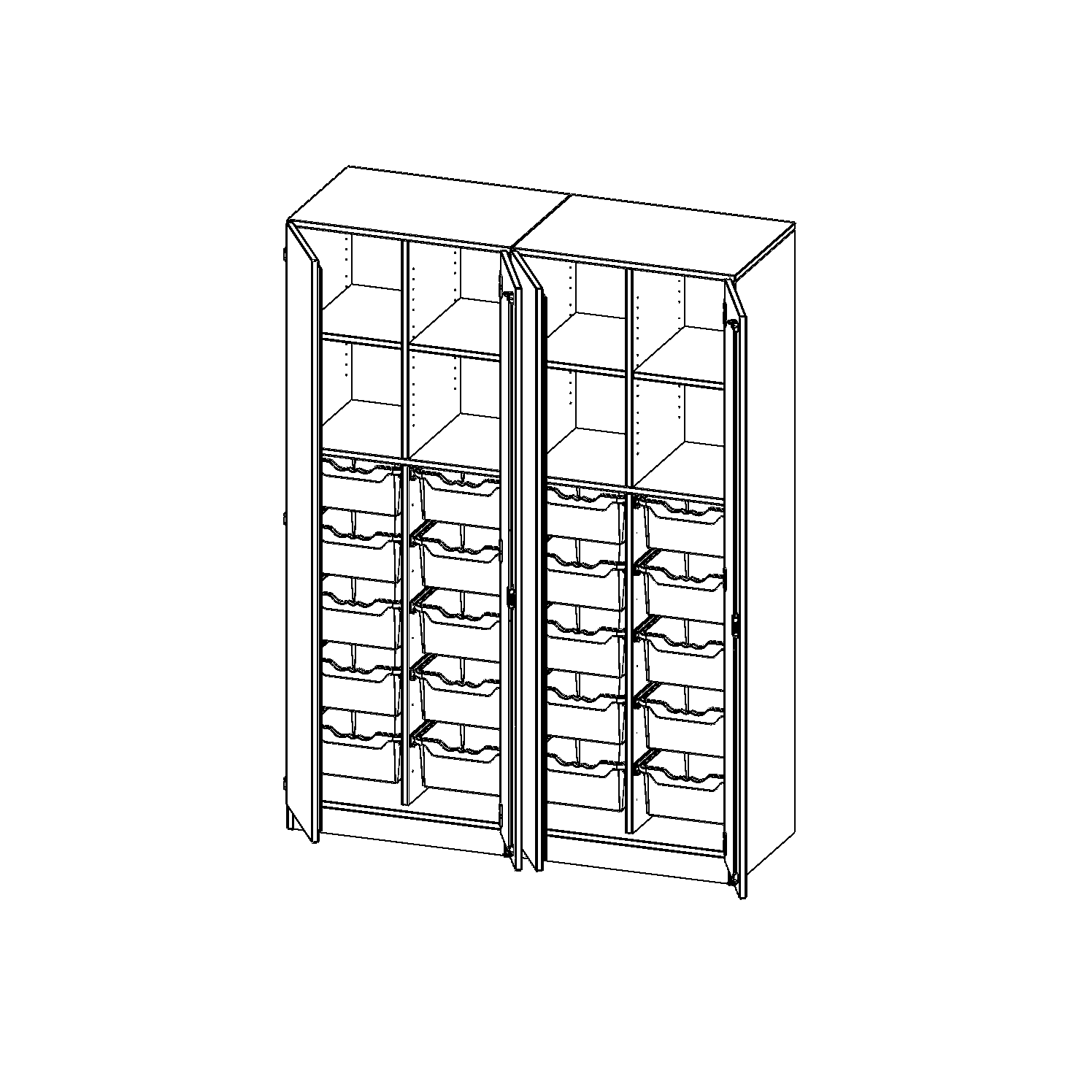 B/H/T: 140,6x190x50 cm, viertürig, zweiteilig, mit Sockel (81 mm), mit 2 Mittelwänden, mit 20 hohen ErgoTray Boxen