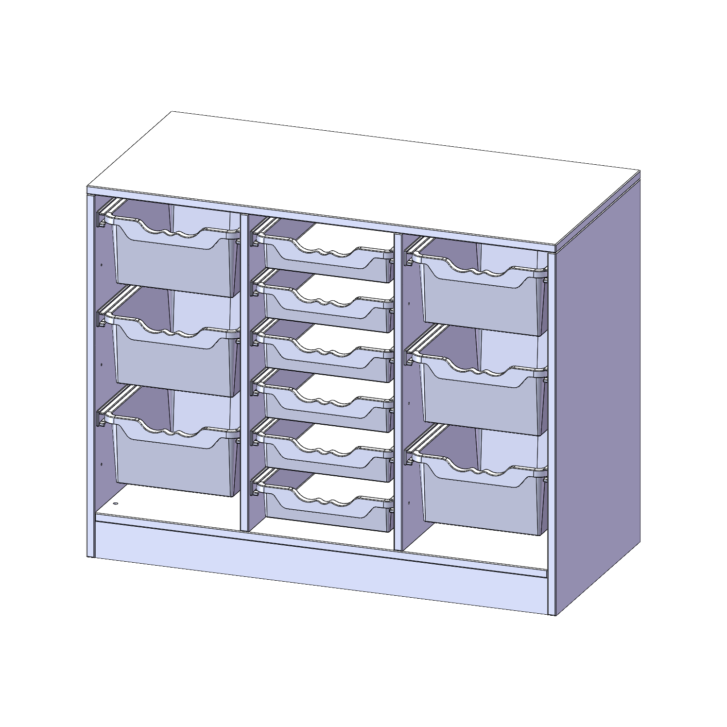 B/H/T: 104,5x82x50 cm, mit Sockel (81 mm), rechts und links je 3 hohe, in der Mitte 6 flache ErgoTray Boxen