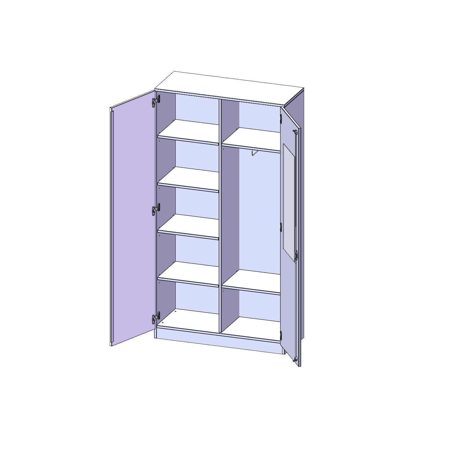 Auf der Innenseite einer der Türen befindet sich ein flächig aufgeklebter Spiegel (splitterbindende Folie). Weiterhin befinden sich im Schrank 2 Einlegeböden (Hut- und Schuhablage) sowie eine Kleiderstange.