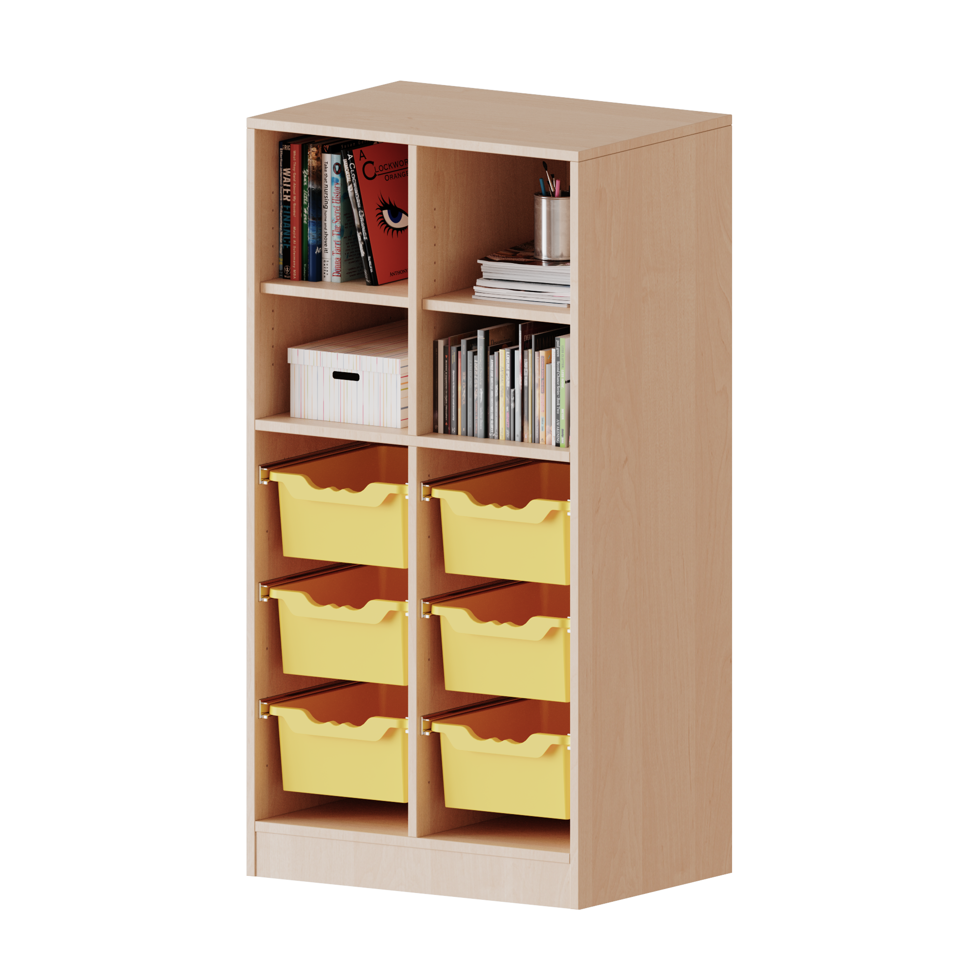 Breite 70,3 cm, Gesamthöhe 136 cm, mit Sockel, oben 4 Fächer, unten 6 hohe ErgoTray Boxen