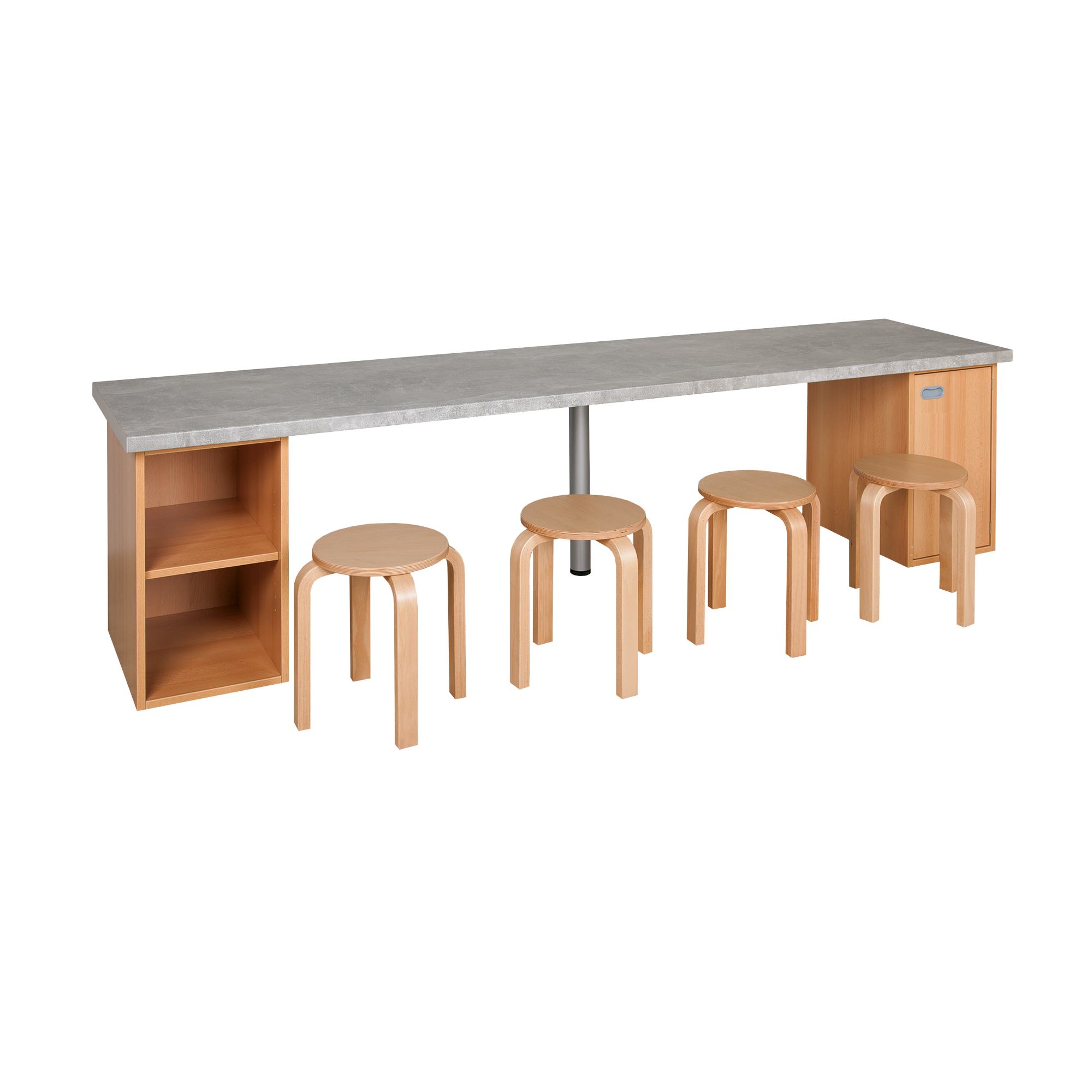 Bastelarbeitsplätze sind der ideale Ausgangspunkt für kindliche Kreativität, beginnende Handwerkskunst, eigenständige künstlerische Produktgestaltung oder auch die stabile Basis für die verschiedensten handfesten Arbeiten und Bastelprojekte - oder schlichte Lehrplanaufgaben! Die stabile dicke Arbeitsplatte mit der großzügig gerundeten Vorderkante in der Qualität einer Küchenarbeitsplatte ist durch ihre strapazierfähige Beschichtung mechanisch und chemisch sehr widerstandsfähig. Aufgrund der Anordnung von mehreren Arbeitsplätze nebeneinander können sich die kleinen Handwerker, Künstler und Bastelfreaks auch gegenseitig helfen oder sich über den Stand ihrer Projekte austauschen.