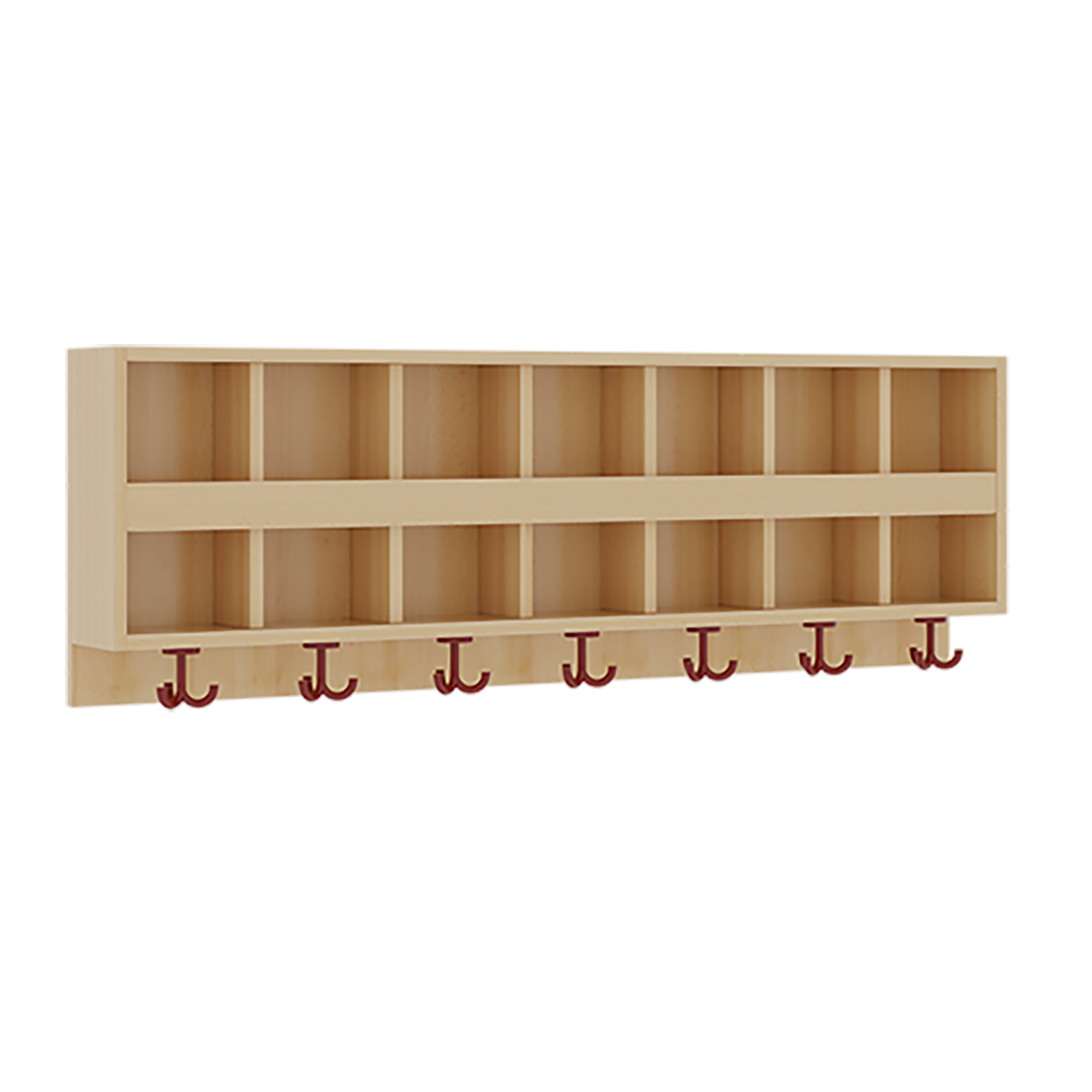 Die Ablagen aus melaminbeschichteter Spanplatte haben 15 und 17 cm hohe Fächer sowie eine Bilderleiste, darüber 5 cm hohe Ablagen, das verwendete feuerhemmende B1-Material besitzt als Dekor Buche. Unter der Fachablage sind in Anzahl der Plätze farbige drehbare Dreifachhaken montiert. Die Breite und damit die Anzahl der Plätze sind wählbar.