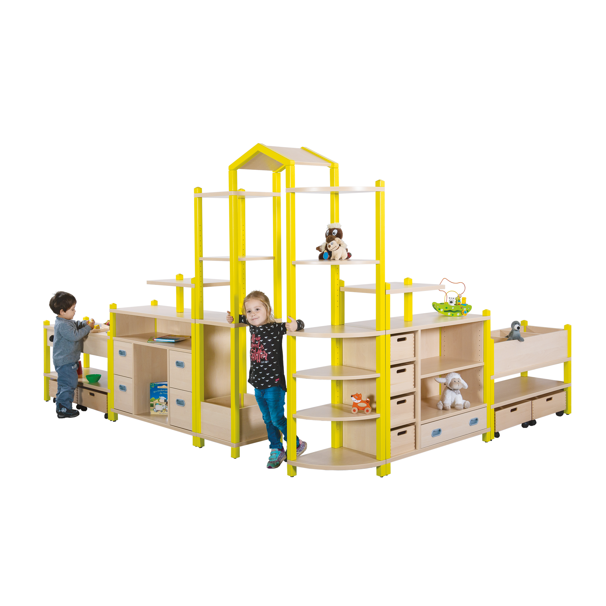 Dieses Regalsystem eignet sich perfekt für die Einrichtung von Gruppenräumen, Spiel- und Leseecken.