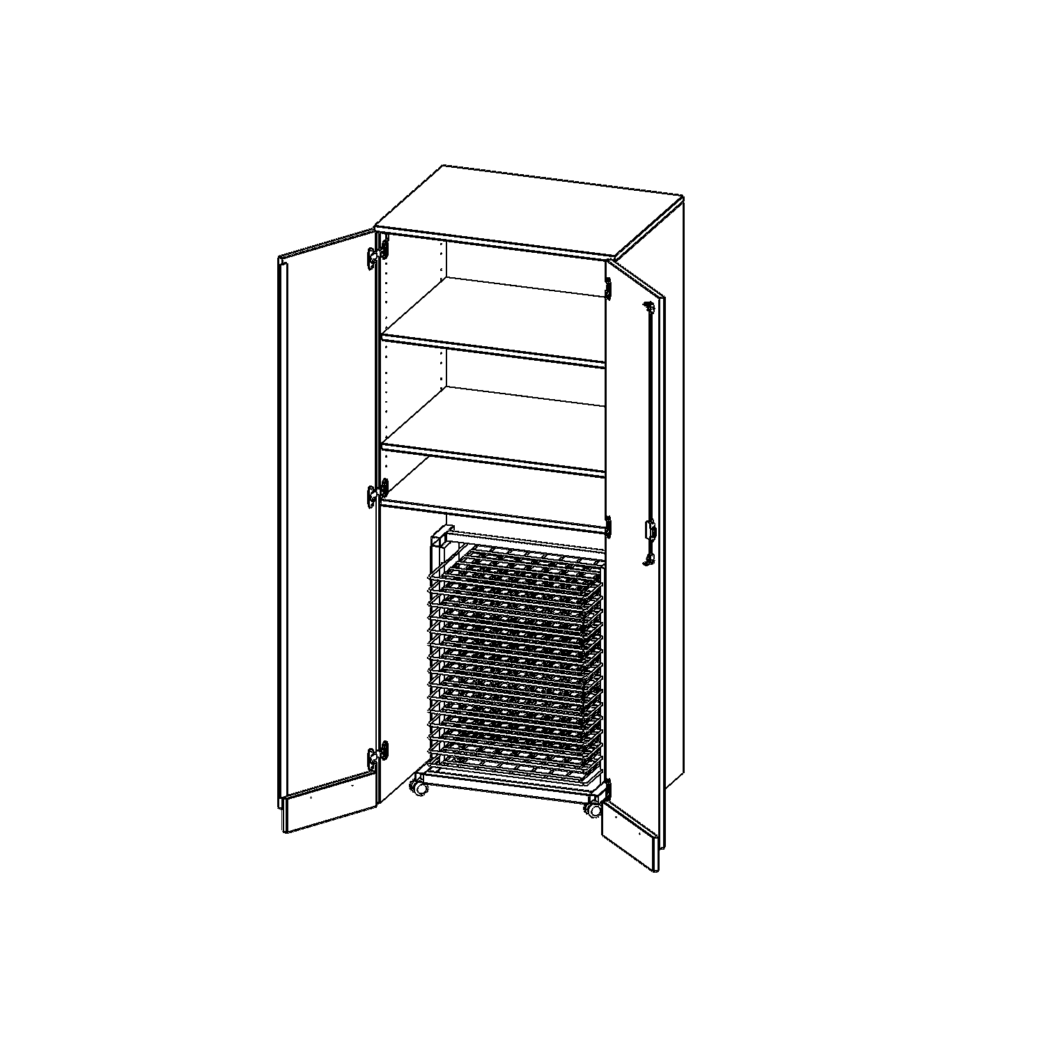 Unsere Garagenschränke bieten wir in verschiedenen Breiten und Ausstattungsvarianten an. Diese Schränke besitzen Türen mit Sockelblenden, damit die Optik der evo-Möbel durchgehend gewahrt wird und sich die eingeschobenen Wagen und Container trotzdem aus dem Schrank fahren lassen. Innen stehen praktische Rollcontainer oder Trockenwagen, die Sie bei Bedarf einfach aus dem Schrank herausrollen und dort verwenden können, wo Sie diese gerade benötigen. Nach dem Unterricht einfach wieder in den Schrank schieben und im Nu ist alles aufgeräumt. Um die Stabilität dieser Schrankkonstruktion zu garantieren, ist im Garagenbereich ein 3seitiger Stahlrahmen verbaut. Die Bauweise bedingt die zerlegte Anlieferung des Schrankes, die Korpusmontage muss vor Ort erfolgen.