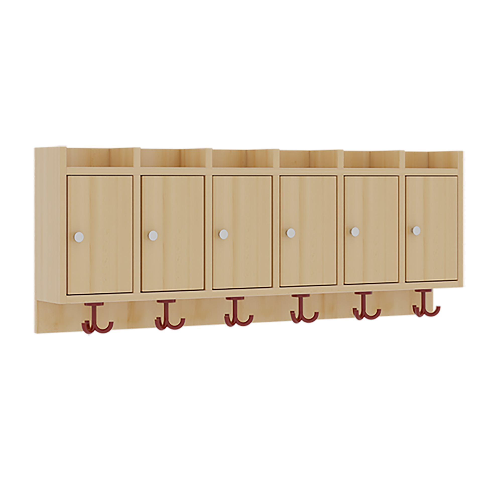 Die Ablagen aus melaminbeschichteter Spanplatte haben 34 cm hohe Fächer mit rechts hängenden Türen und darüber 5 cm hohe Ablagen, das Dekor ist wählbar. Unter der Fachablage sind in Anzahl der Plätze farbige drehbare Dreifachhaken montiert. Die Breite und damit die Anzahl der Plätze sind wählbar.