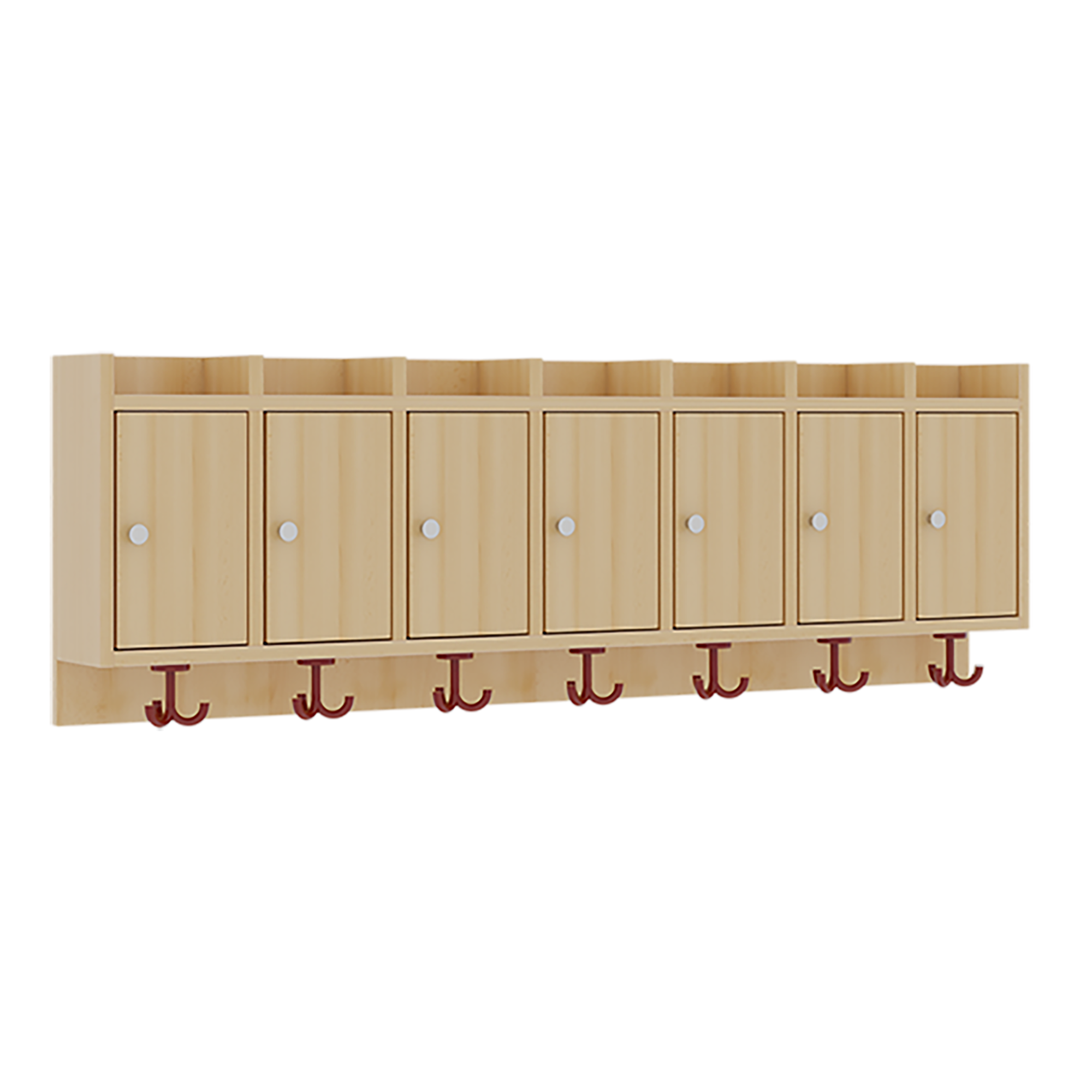 Die Ablagen aus melaminbeschichteter Spanplatte haben 34 cm hohe Fächer mit rechts hängenden Türen und darüber 5 cm hohe Ablagen, das Dekor ist wählbar. Unter der Fachablage sind in Anzahl der Plätze farbige drehbare Dreifachhaken montiert. Die Breite und damit die Anzahl der Plätze sind wählbar.