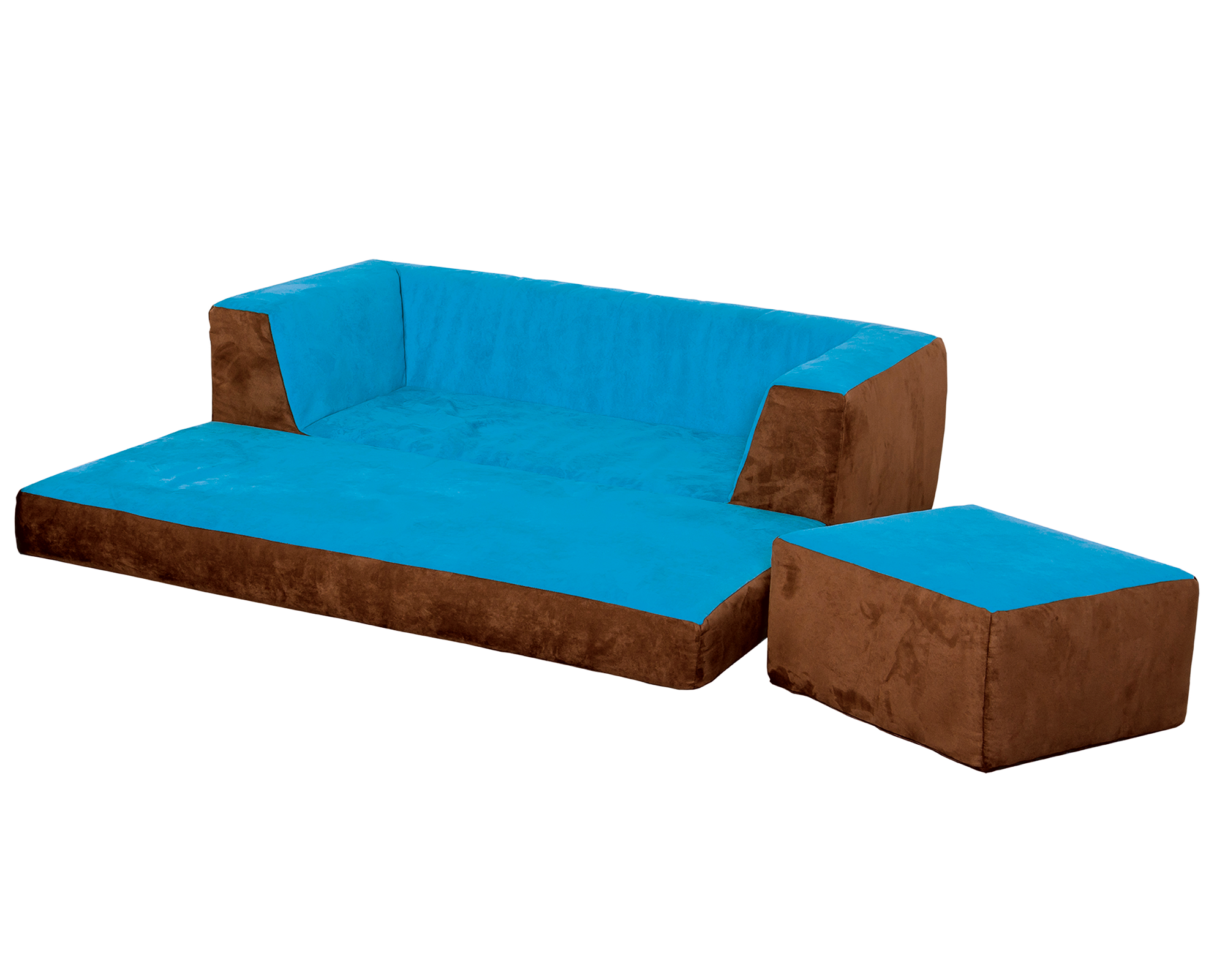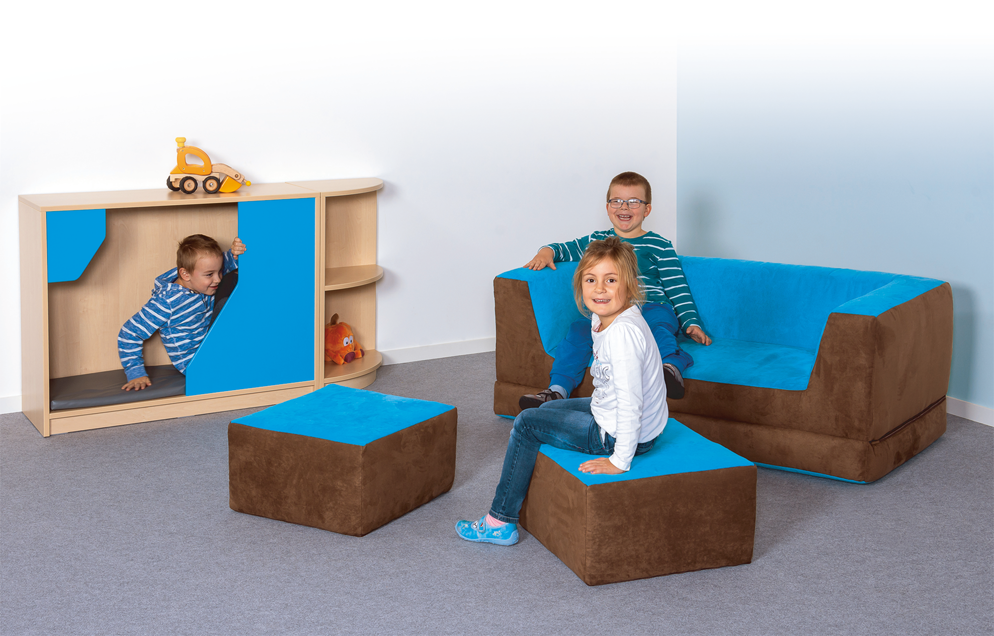 Aufgeklappt ist es eine tolle Ruheinsel, als Sofa bildet es mit den beiden Hockern eine gemütliche Sitzgruppe für Spiele oder zum Lesen.