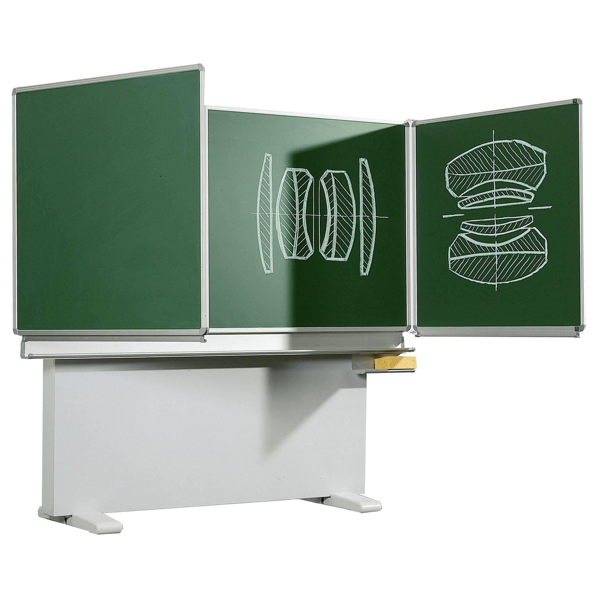 Alle Tafelecken sind abgedeckt durch profilübergreifende, gerundete Eckkappen aus ABS-Kunststoff. Die Mittelfläche ist zusätzlich mit einer Ablage aus natureloxiertem, gerundetem Alu-Winkelprofil versehen und mit einem untergeschraubten zusätzlichen Fach für Kreide, Stifte oder einen Schwamm schnell ablegen zu können DieTafelflächen sind in Spezial-Aluprofilen (Wandstärke 4 mm) eingefasst. Ein Ausgleichsgewicht wird über eine an der Rahmenkonstruktion verschweißte, kugelgelagerte Vollstahlwelle mit Stahlkettenrädern und einer Präzisionsrollenkette geführt. Der Sicherheits-Standbügel besteht aus kaltgeformten, vollverschweißten Stahlrundrohr.