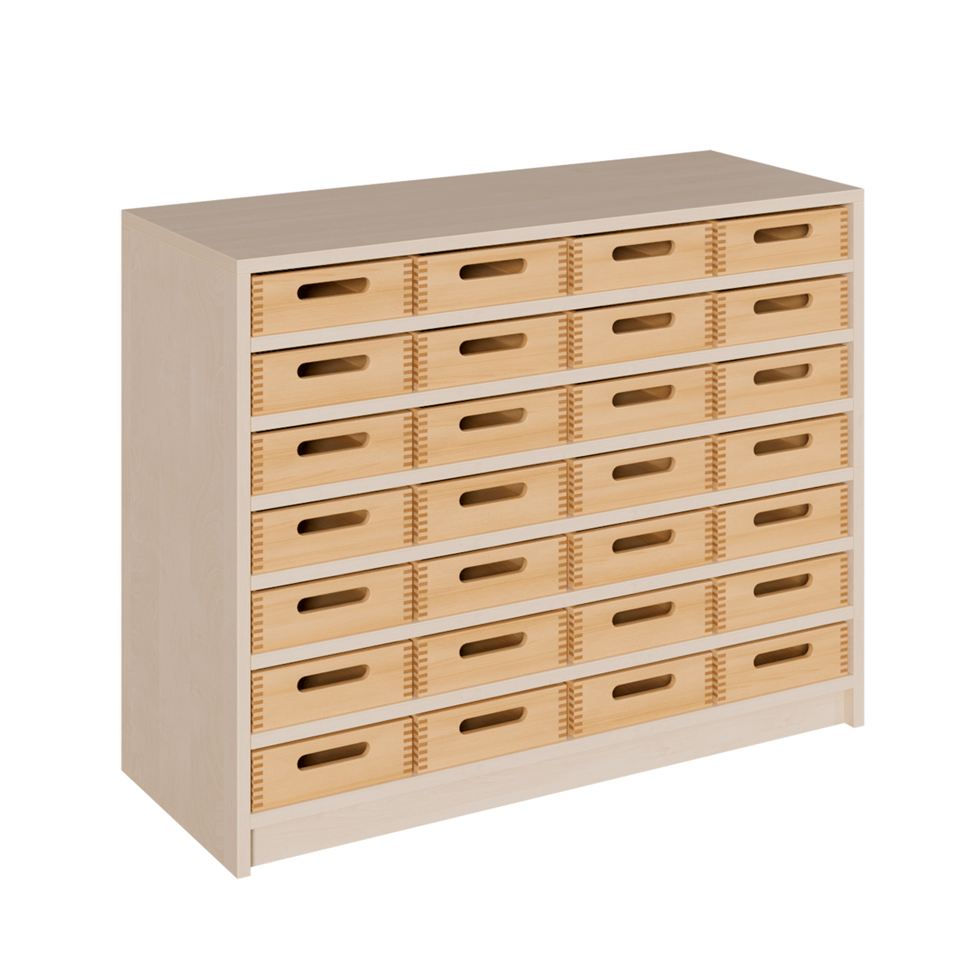 Korpusmaße B/H/T: 102x80x40 cm, mit 28 Massivholzkästen (190 031 00 / HK 10) mit den Innenmaßen 23,5x7,7x36 cm.