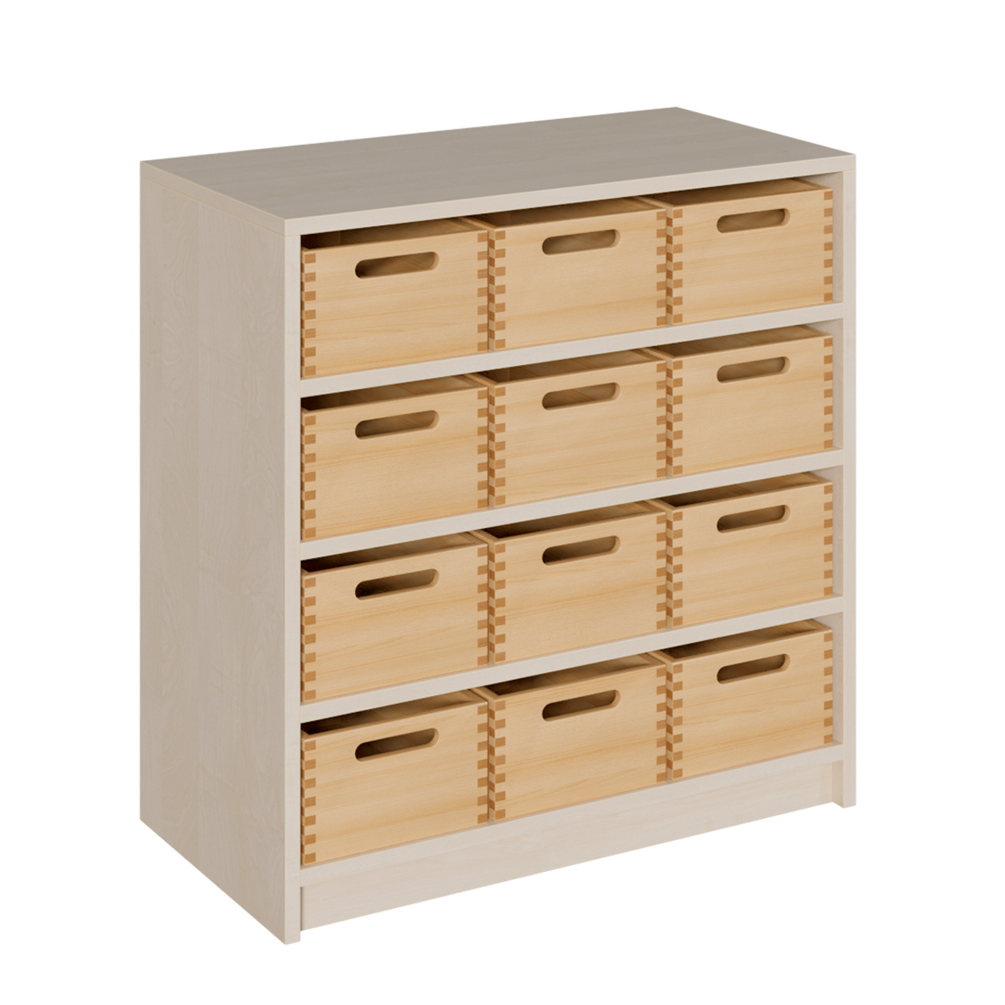 Korpusmaße B/H/T: 78x80x40 cm, mit 12 Massivholzkästen (190 021 00 / HK 11) mit den Innenmaßen 23,5x14x36 cm.