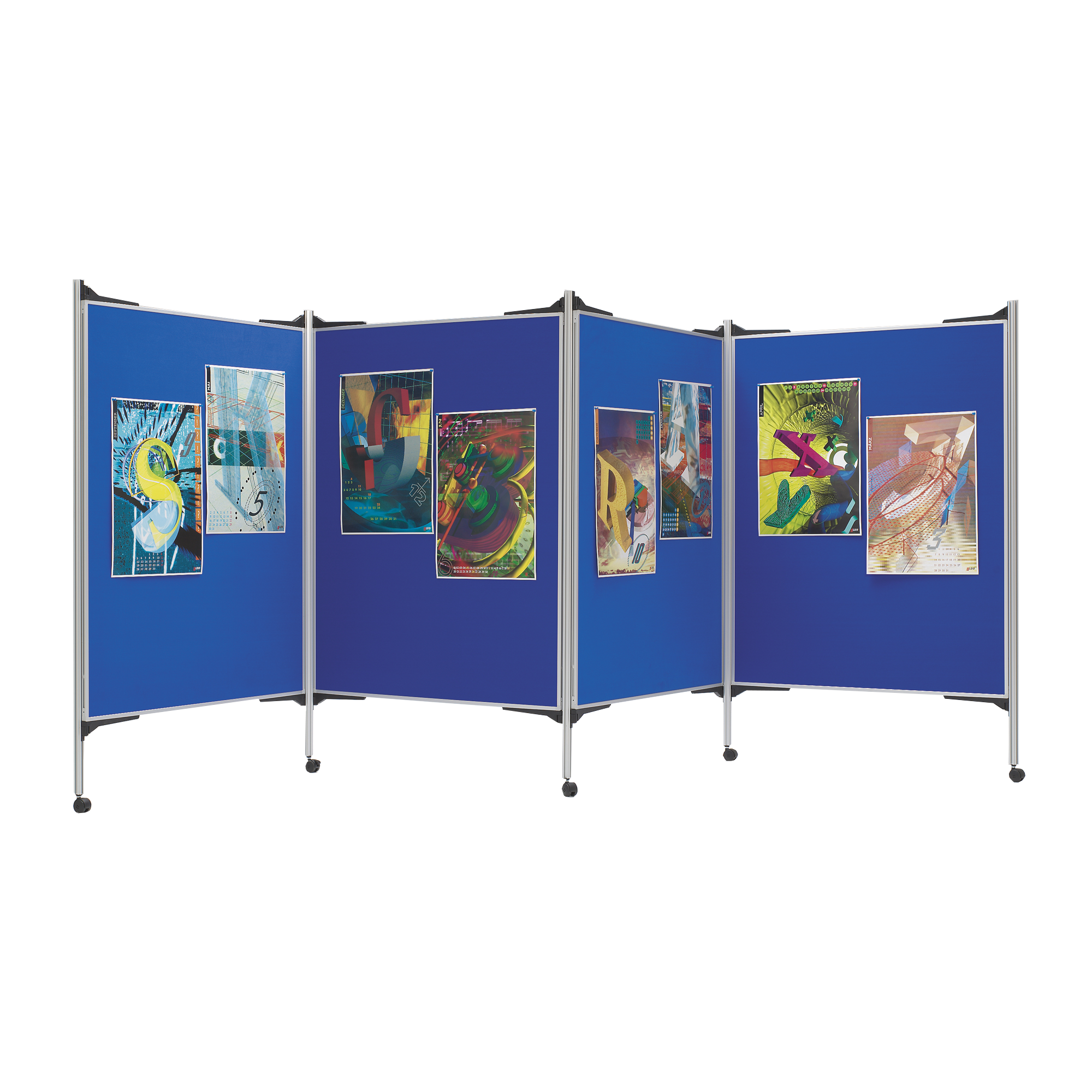 Unsere mobile Stellwandkombination mit Klettenstoffoberfläche bestehend aus 3 Tafelflächen auf Rollen, ist die perfekte Lösung um Bilder oder wichtige Dokumente auszustellen.