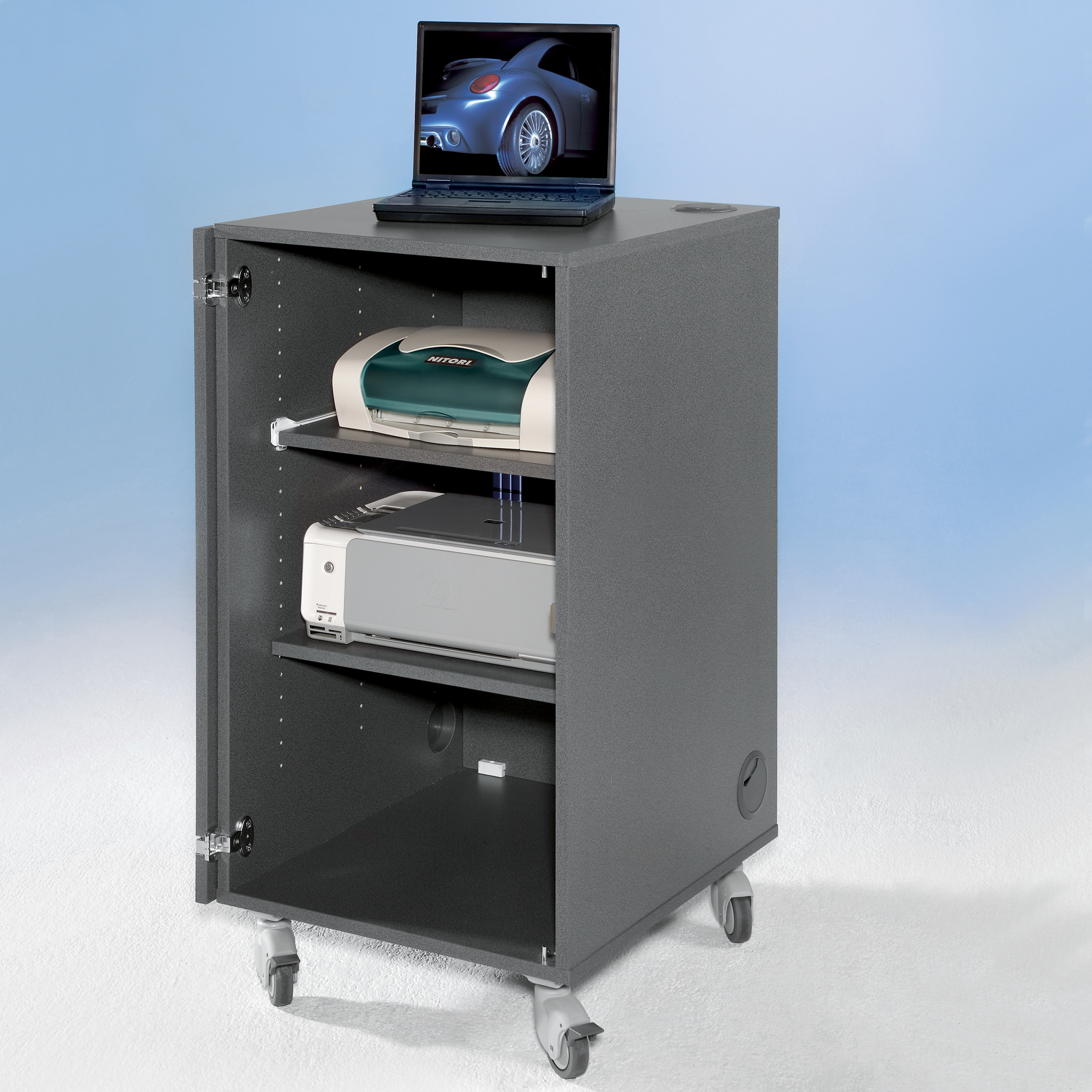 Unser Phono- / Medienwagen mit Kabeldurchlässen in Seiten und Deckel, abschließbarer Vordertür und abnehmbarer Rückwand, ist mit seinen vier Rollen, davon zwei feststellbar, mobil einsetzbar. Ein Tastaturauszug befindet sich in 72 cm Höhe.