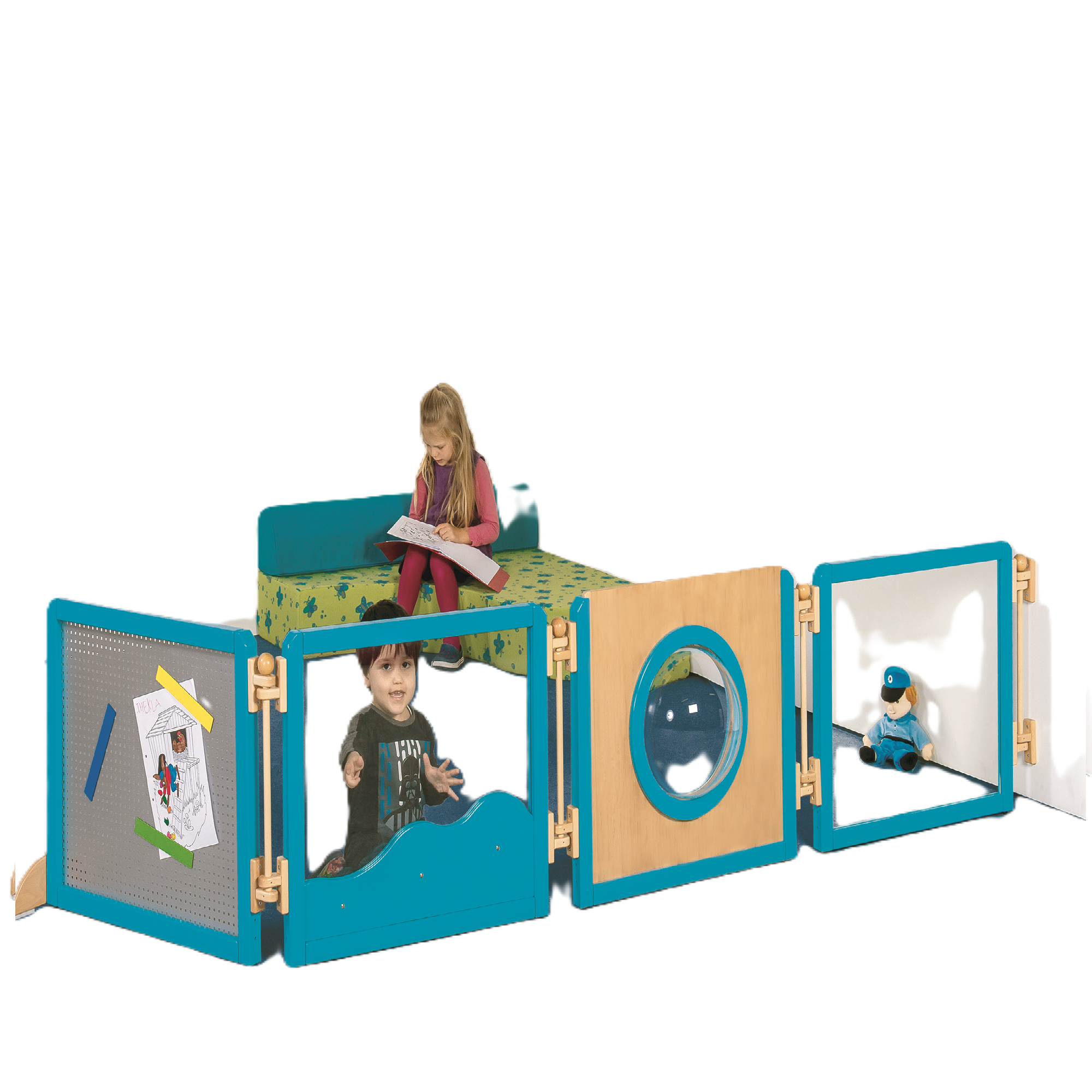 Raumteiler schaffen abgetrennte Spielzonen und Erlebnisräume. Dank verschiedener Motive und Nutzungsmöglichkeiten, lassen sie sich schnell und flexibel zu spannenden Kinderwelten mit unterschiedlichen Eingängen und Durchschlüpfen kombinieren. Verbinder dienen zur Montage der Elemente untereinander und dem Anschluss an weitere Möbel oder die Wand. Sie ermöglichen ein Aufstellen in Reihe und das Weiterbauen "um die Ecke". Bei der Gestaltung der Rahmen kann zwischen naturlackiert oder farbig abgesetzt gewählt werden.