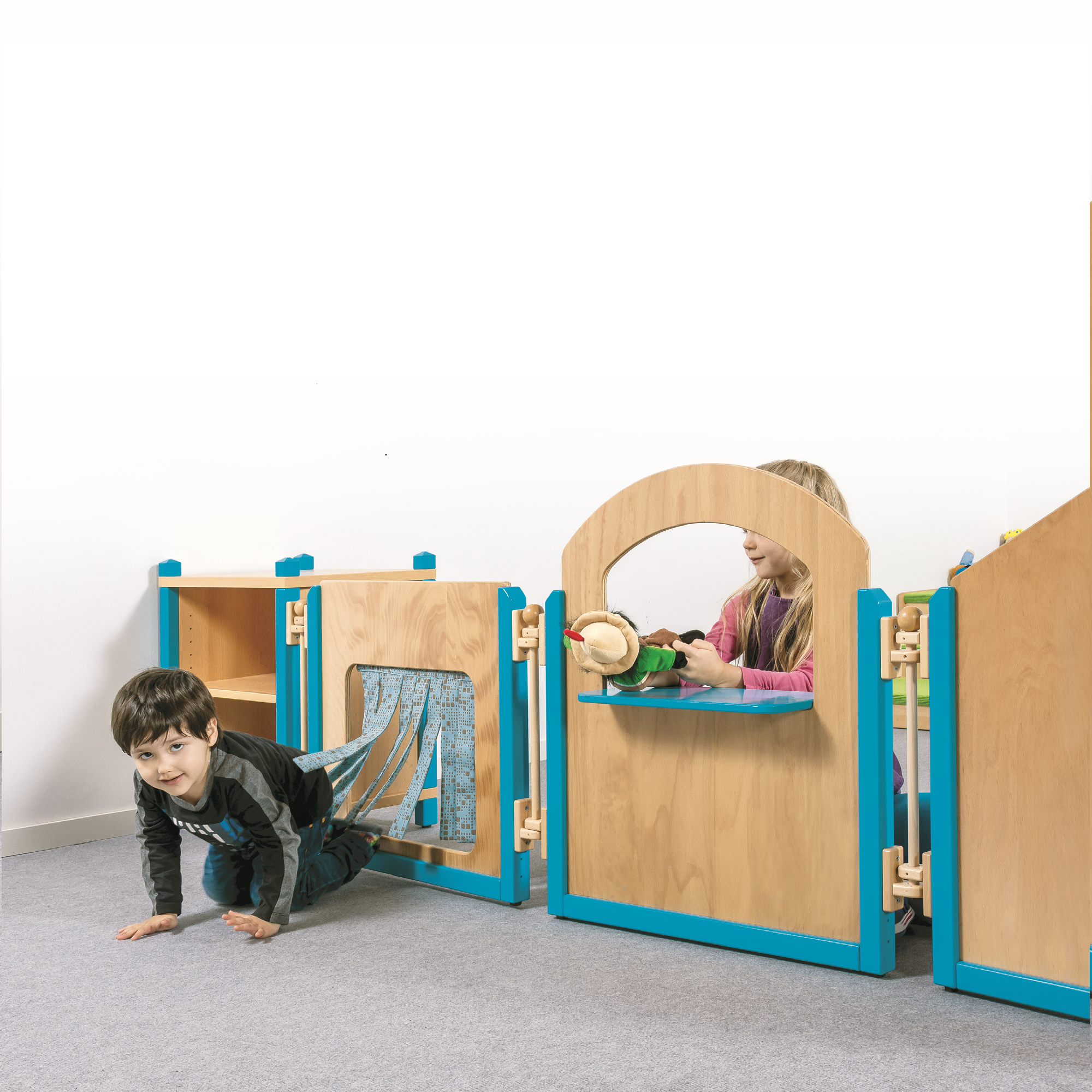 Raumteiler schaffen abgetrennte Spielzonen und Erlebnisräume. Dank verschiedener Motive und Nutzungsmöglichkeiten, lassen sie sich schnell und flexibel zu spannenden Kinderwelten mit unterschiedlichen Eingängen und Durchschlüpfen kombinieren. Verbinder dienen zur Montage der Elemente untereinander und dem Anschluss an weitere Möbel oder die Wand. Sie ermöglichen ein Aufstellen in Reihe und das Weiterbauen "um die Ecke". Bei der Gestaltung der Rahmen kann zwischen naturlackiert oder farbig abgesetzt gewählt werden.