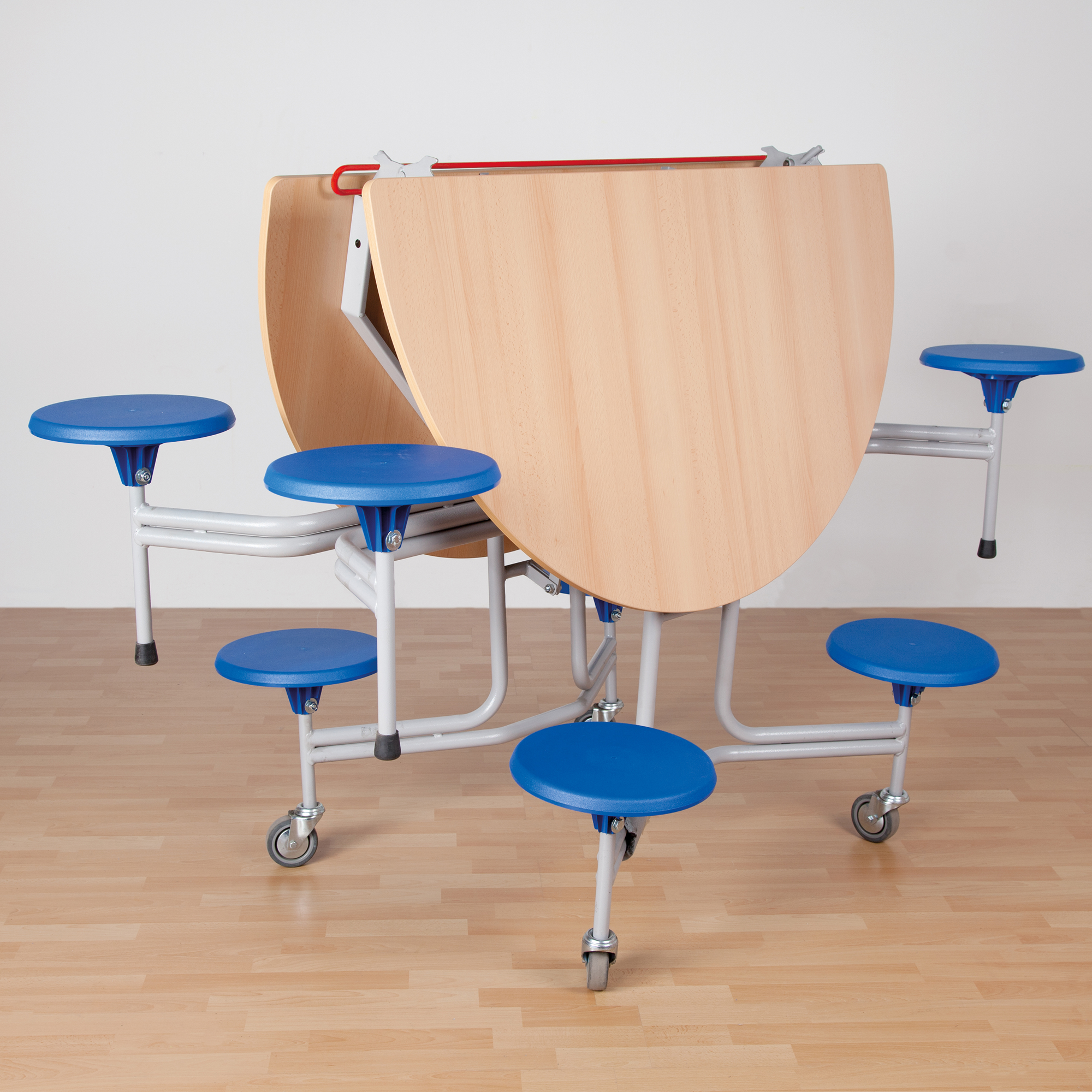 Die fahrbaren Tische sind im zusammengeklappten Zustand sehr mobil und dank des praktischen Klappmechanismus ganz einfach aufzustellen. Durch die Transportsperre wird ein sicheres Hantieren ermöglicht.