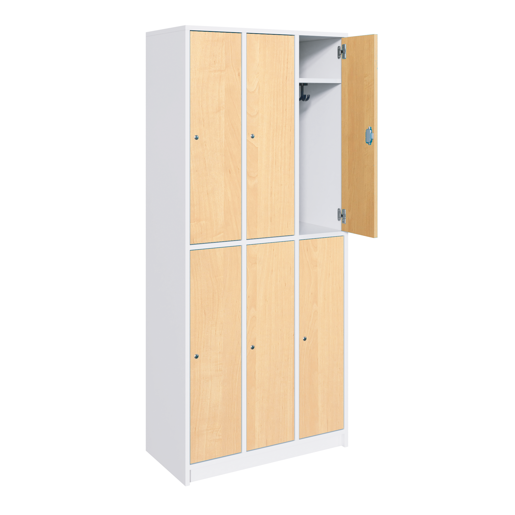 Schließfachschrank mit verschieden schließenden Türen mit Rechtsanschlag. In jedem Abteil befindet sich jeweils oben ein fester Hutboden mit einem drehbaren Dreifachhaken (Farbe wählbar) an der Unterseite, bei durchgehenden Türen / Fächern im unteren Teil ein zusätzlicher Fachboden als Abdeckung für das Schuhfach. Jedes Fach verfügt über ein Lüftungsgitter in der Rückwand.
