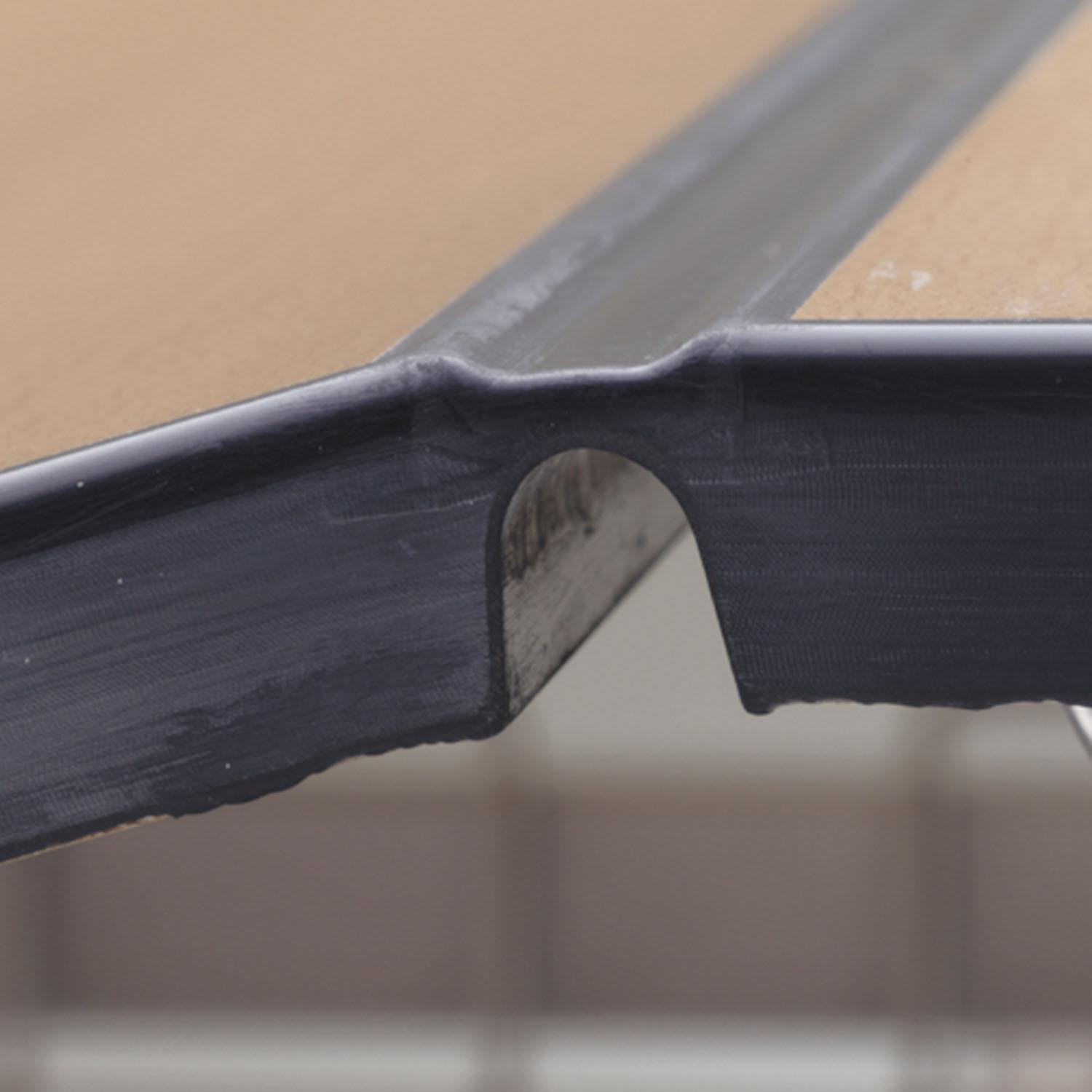 Das T-Fuß Gestell sorgt für eine hohe Stabilität. Die 22 mm starke melaminharzbeschichtete Spanplatte ist mit einer geschlossenen PU-Sicherheitskante versehen.