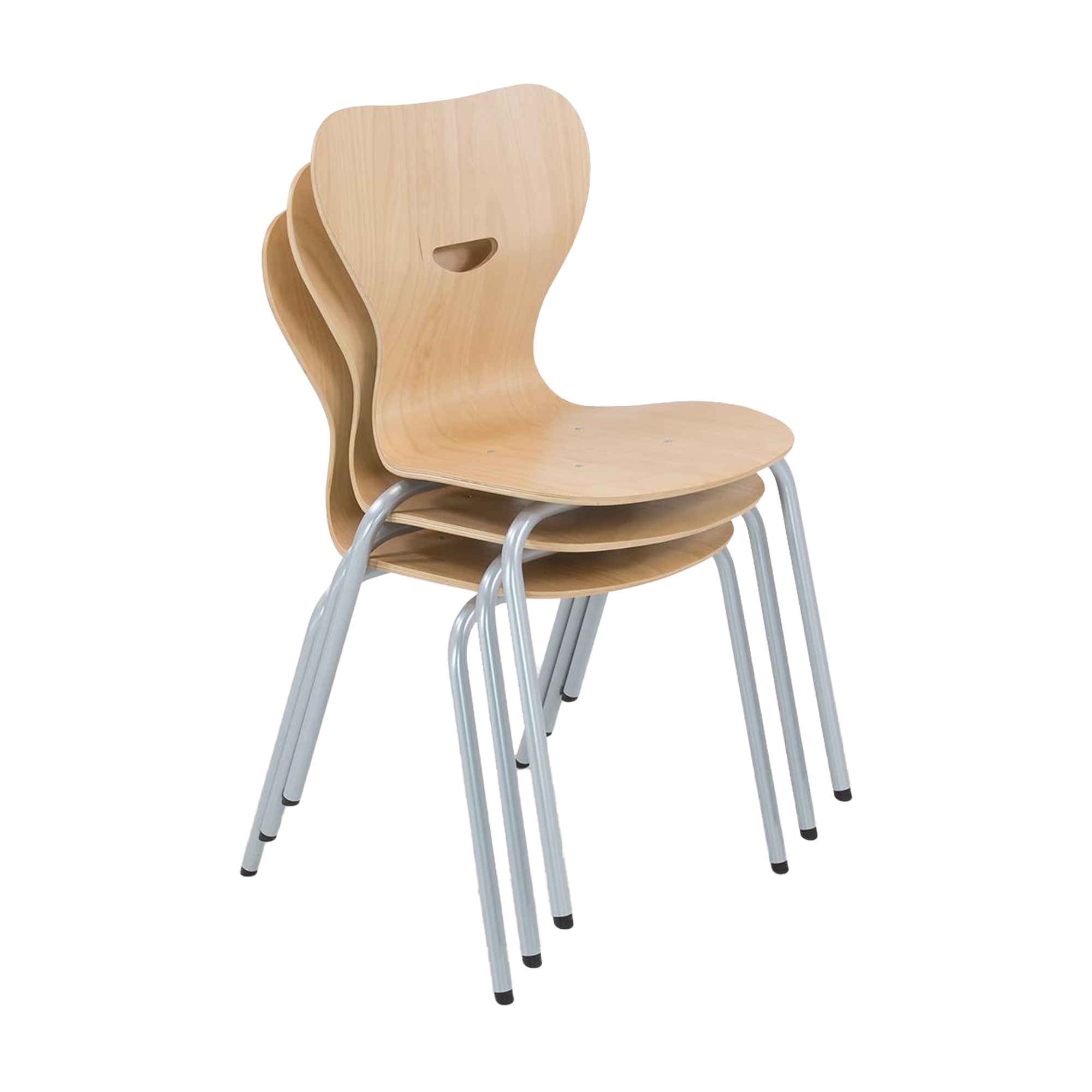 Unser stapelbarer Vierbeinstuhl zeichnet sich durch seine ergonomisch geformte Sitzschale Typ S, aus Buchensperrholz naturlackiert, mit Griffloch, aus.