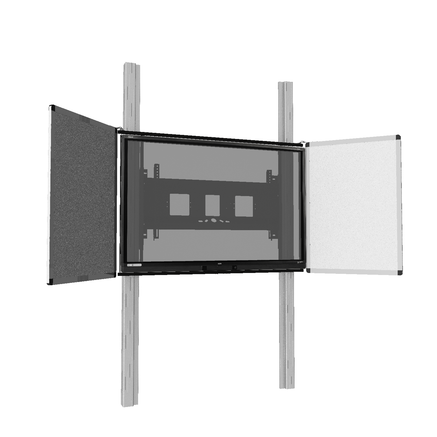 Per manueller Höhenverstellung lässt sich die komplette Monitor Wandhalterung an den zwei an der Wand und am Boden montierten Aluminiumpylonen in der Höhe verstellen. Dadurch ist gewährleistet, dass jeder Benutzer in der für ihn ergonomisch besten Höhe arbeiten und präsentieren kann. Rechts und links neben dem Touchscreen Display befinden sich zwei fest montierte Seitenflügel, die magnethaftend, beschreibbar und trocken abwischbar sind. Eingefasst sind alle Flügel in Aluminiumprofile, wasserfest verklebt und schwarz eloxiert. Für die Höheverstellung wird im Standard ein Griff mitgeliefert.