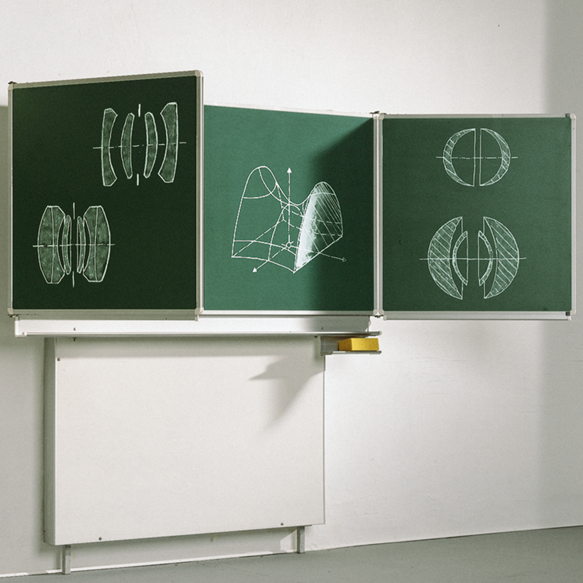 Ein weiteres Highlight ist die funktionale Kreideablage an der Mittelfläche. Gefertigt aus gerundetem, natureloxiertem Aluminium-Winkelprofil mit einer Schenkellänge von 100 mm, bietet sie ausreichend Platz für Kreide und Schwamm. Der untergeschraubte Kreide- und Schwammbehälter aus ABS-Kunststoff gewährleistet Ordnung und leichte Erreichbarkeit der Schreibutensilien.