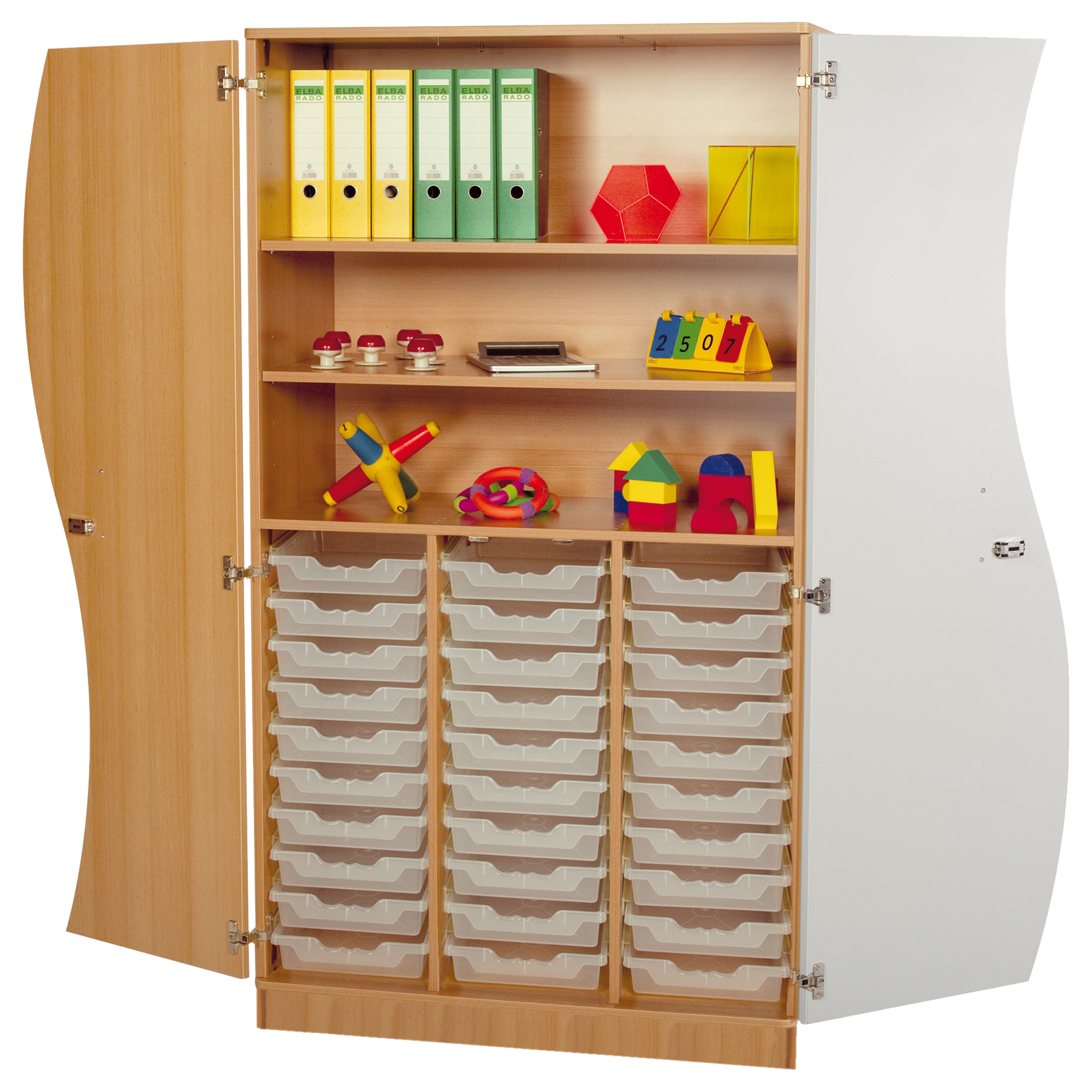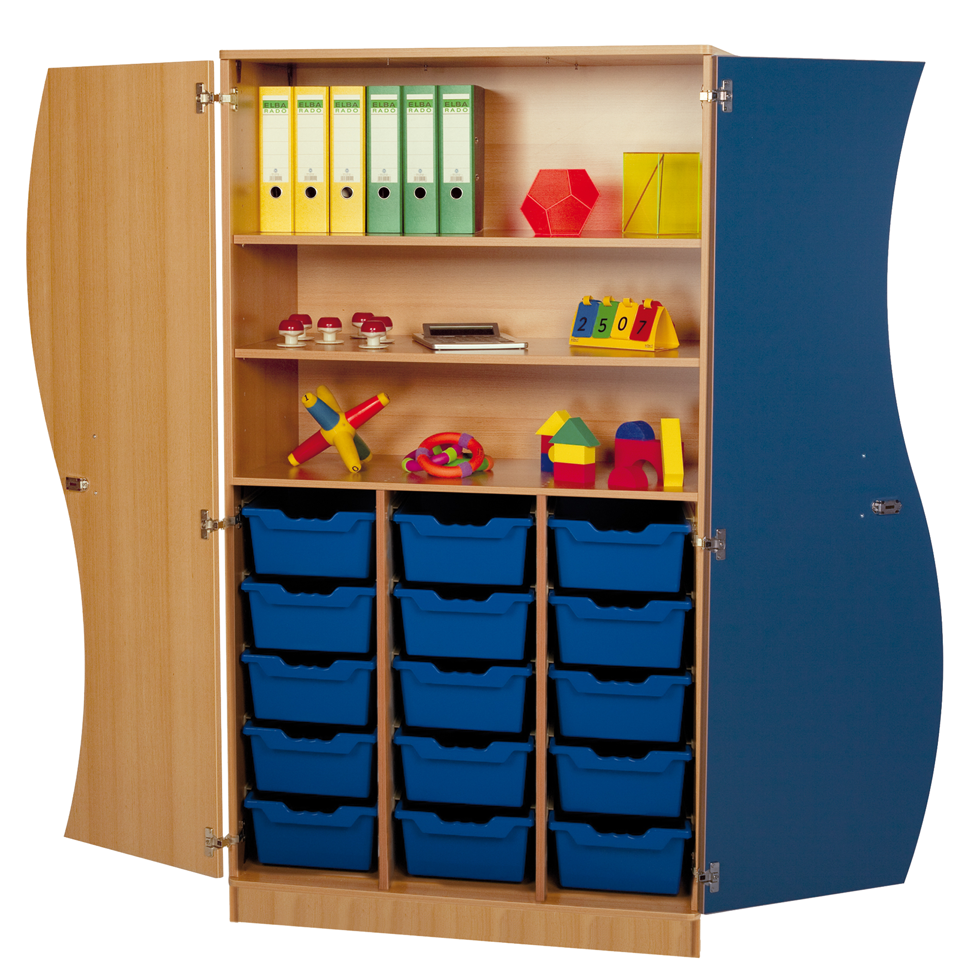 Der besondere Klassenraumschrank mit Wellentüren und 20 ErgoTray Boxen hat das gewisse Etwas: Die Türen mit der Welle.