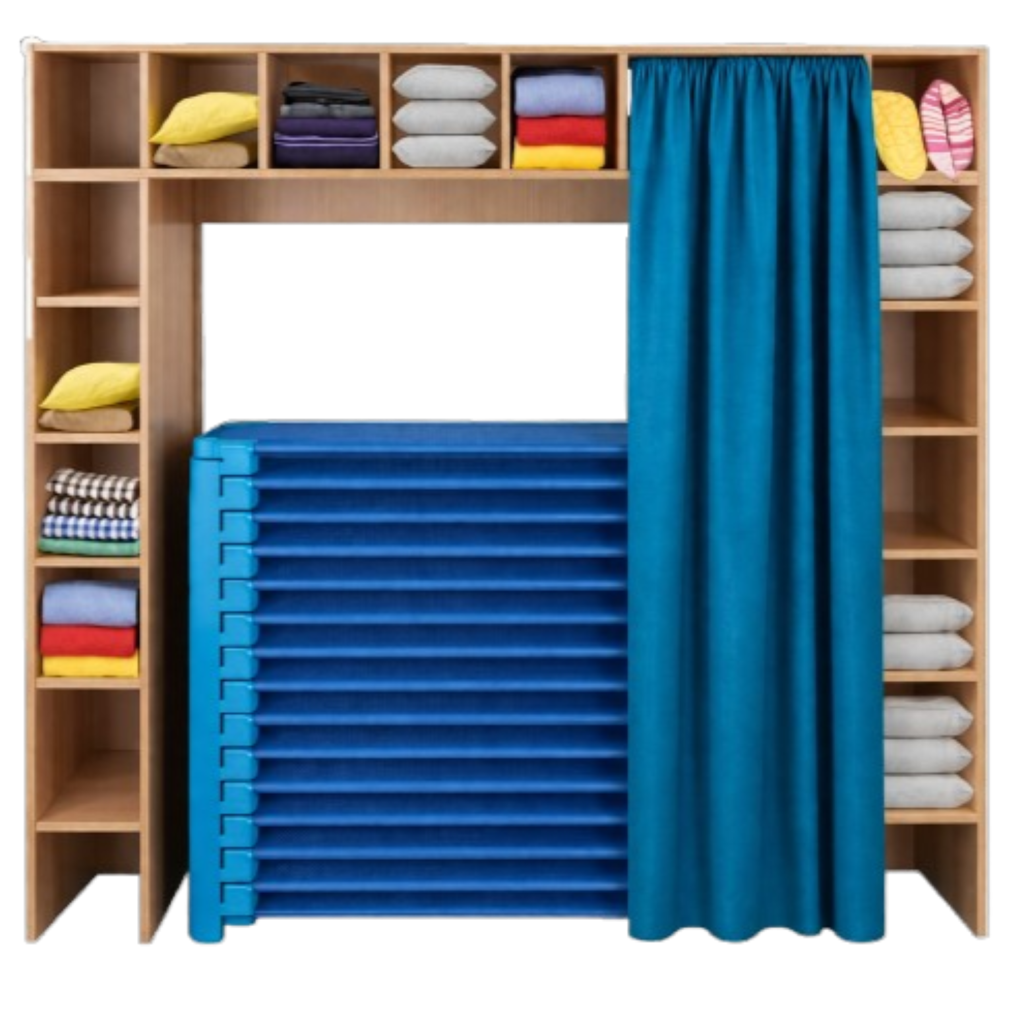 Regal für Stapelliegen mit Vorhangeinrichtung