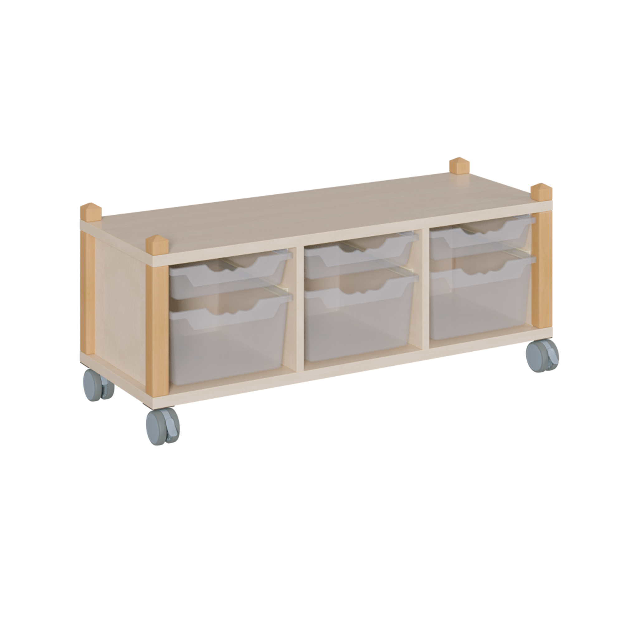 B/T: 109x40 cm, 3reihig, 3 verschiedene Höhen, in 3 Reihen unterschiedlich hohe ErgoTray-Boxen