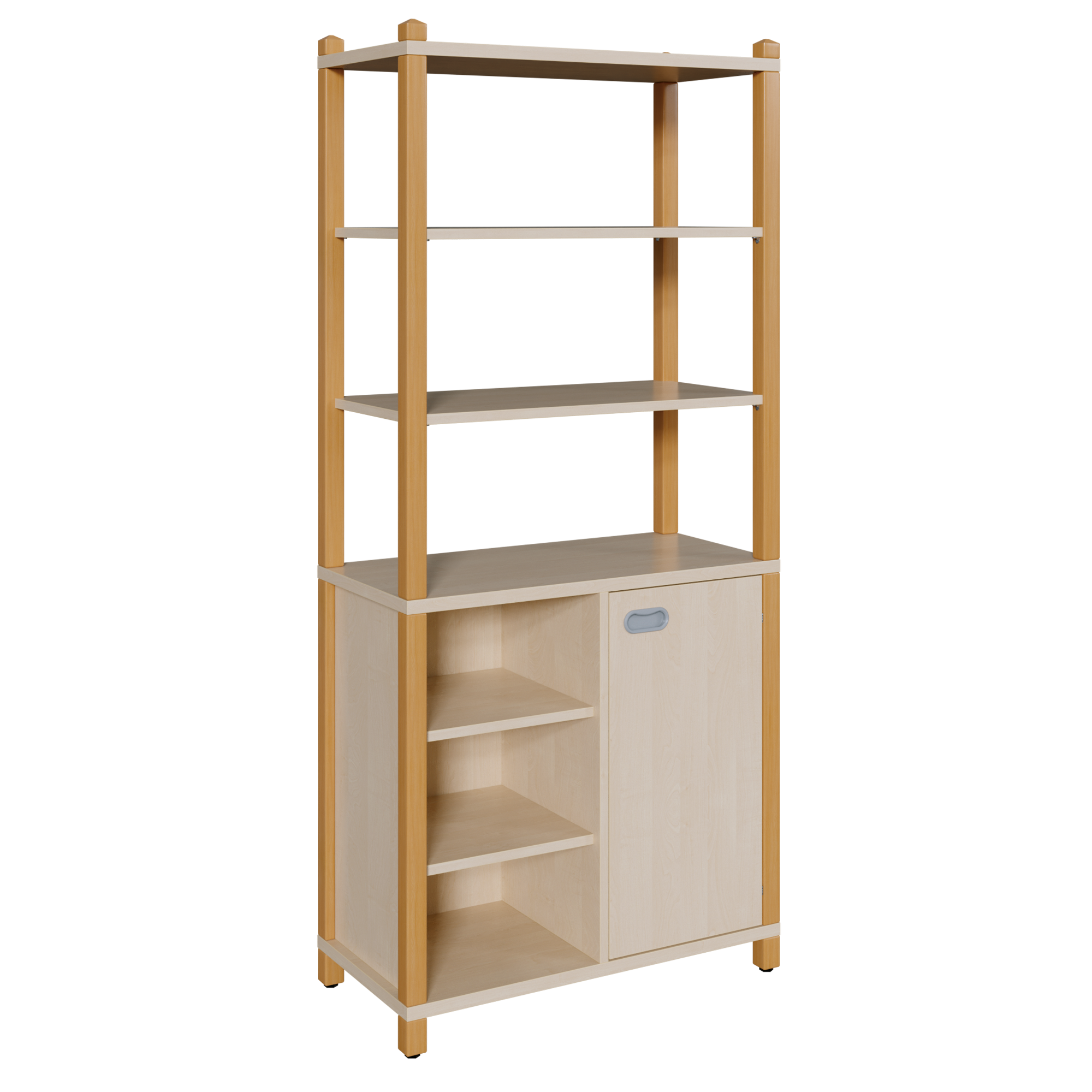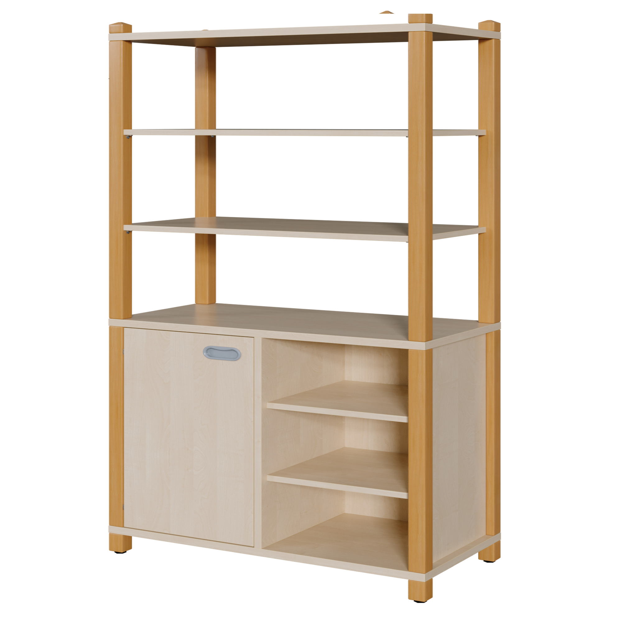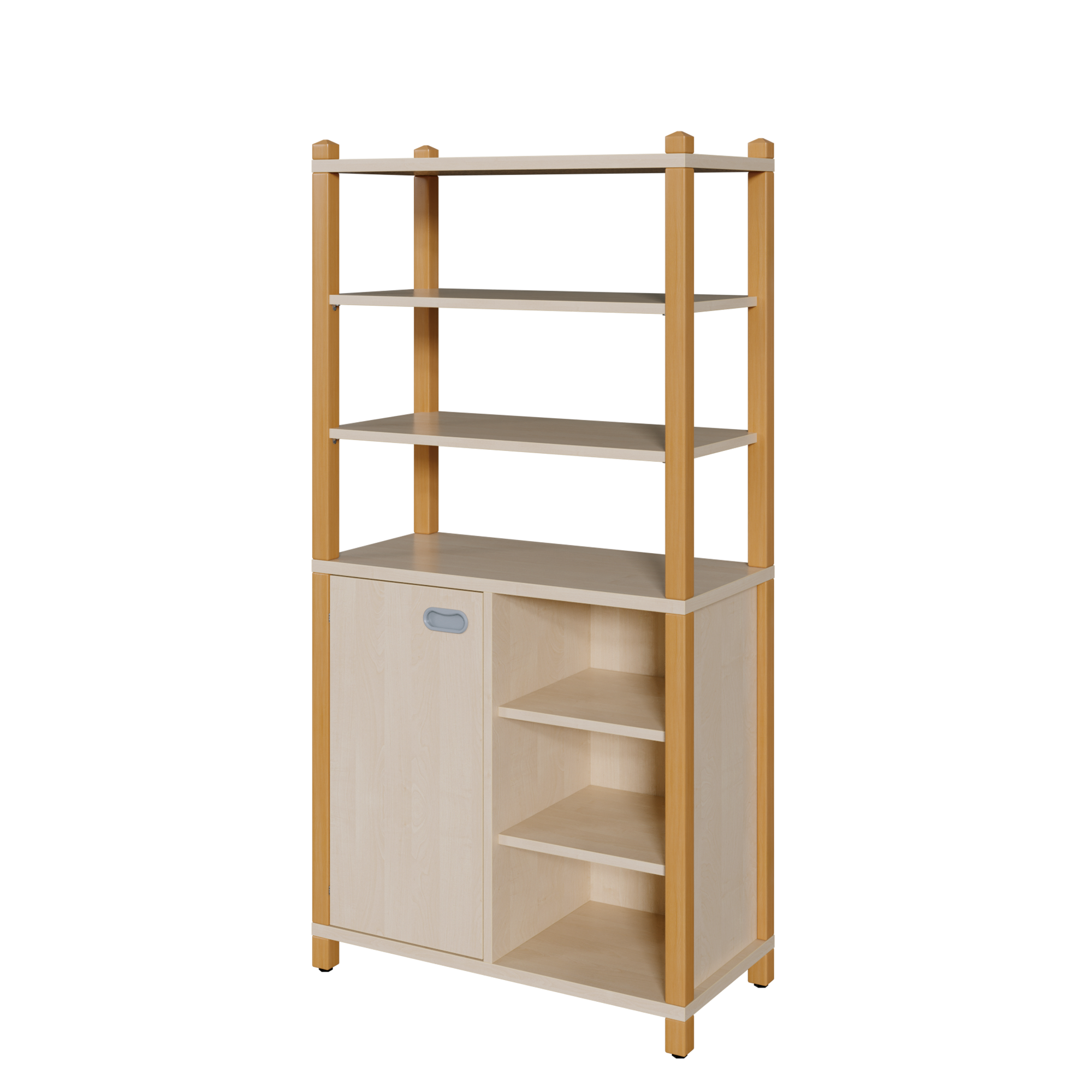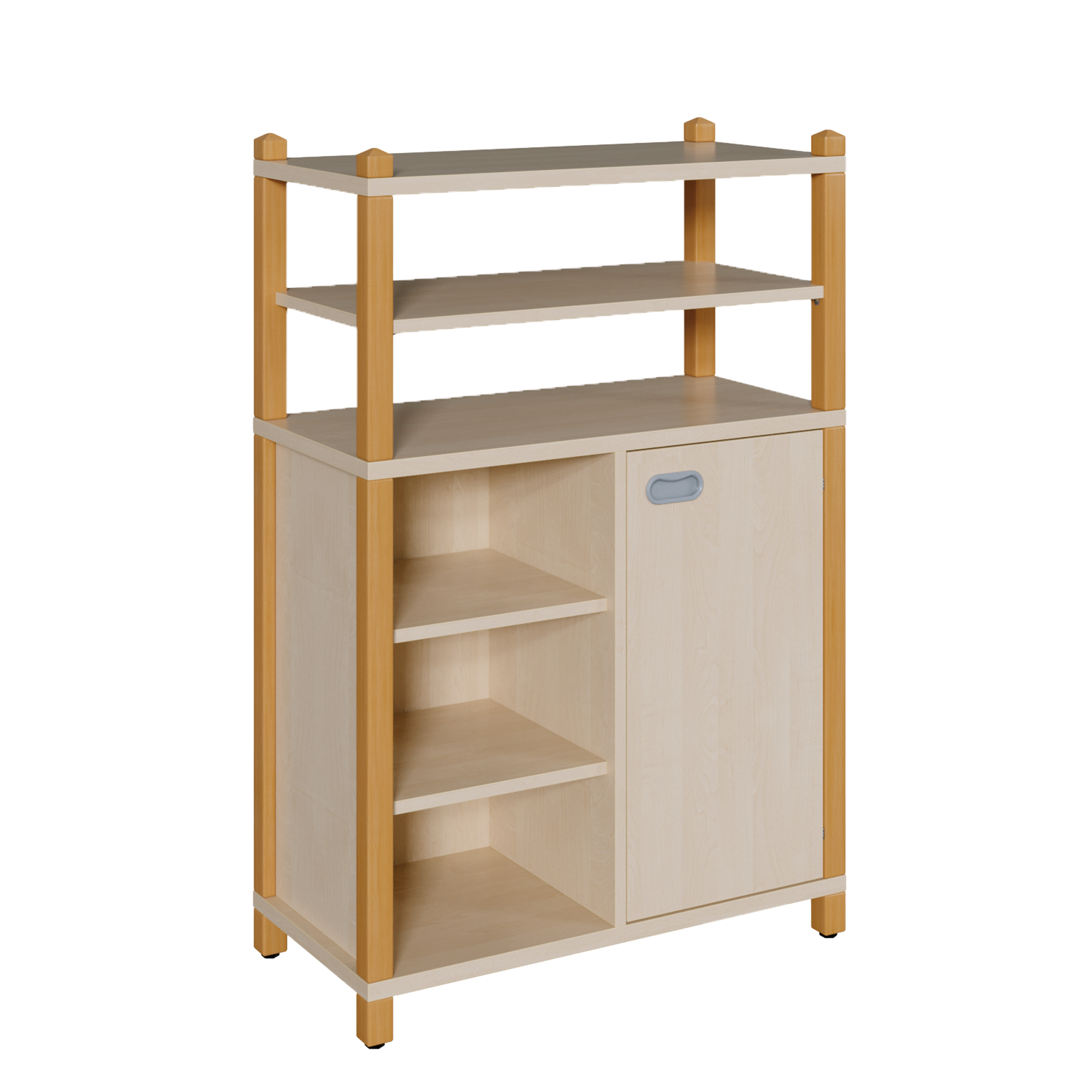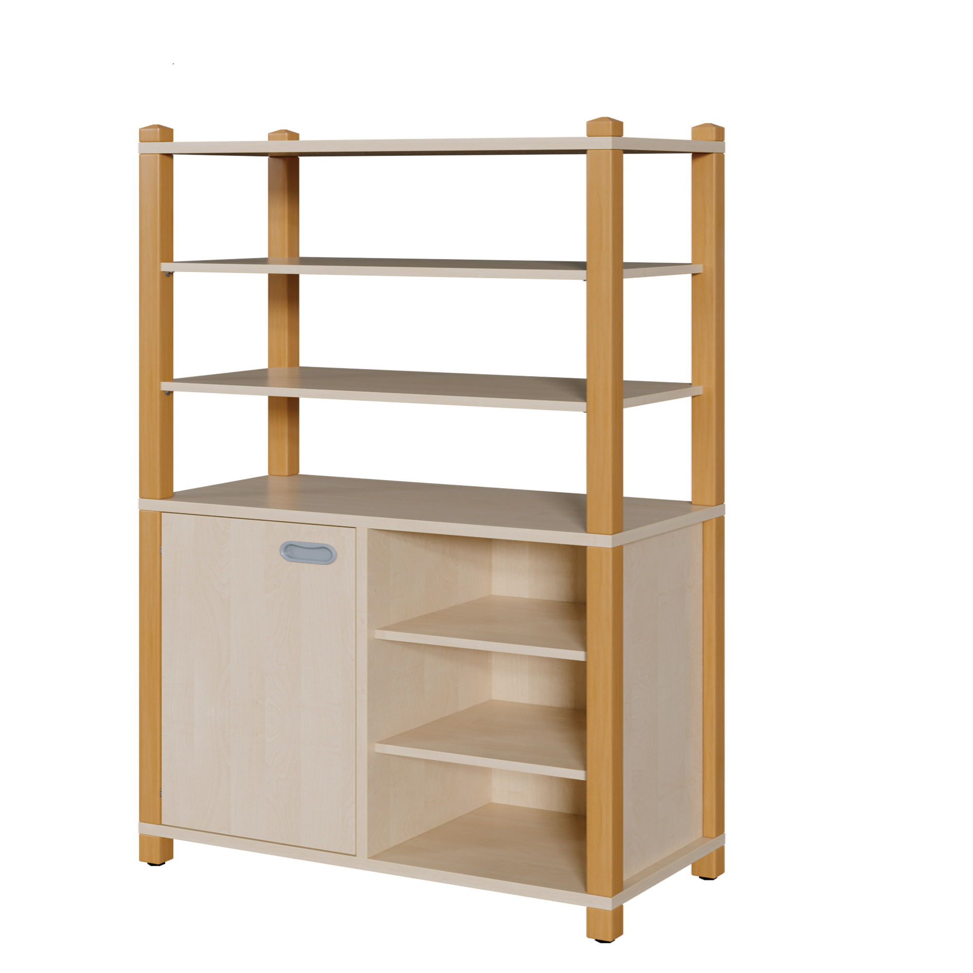 Stollen-Schrank mit einseitiger Tür und 3 offenen Fächern, hoher offener Regalaufsatz