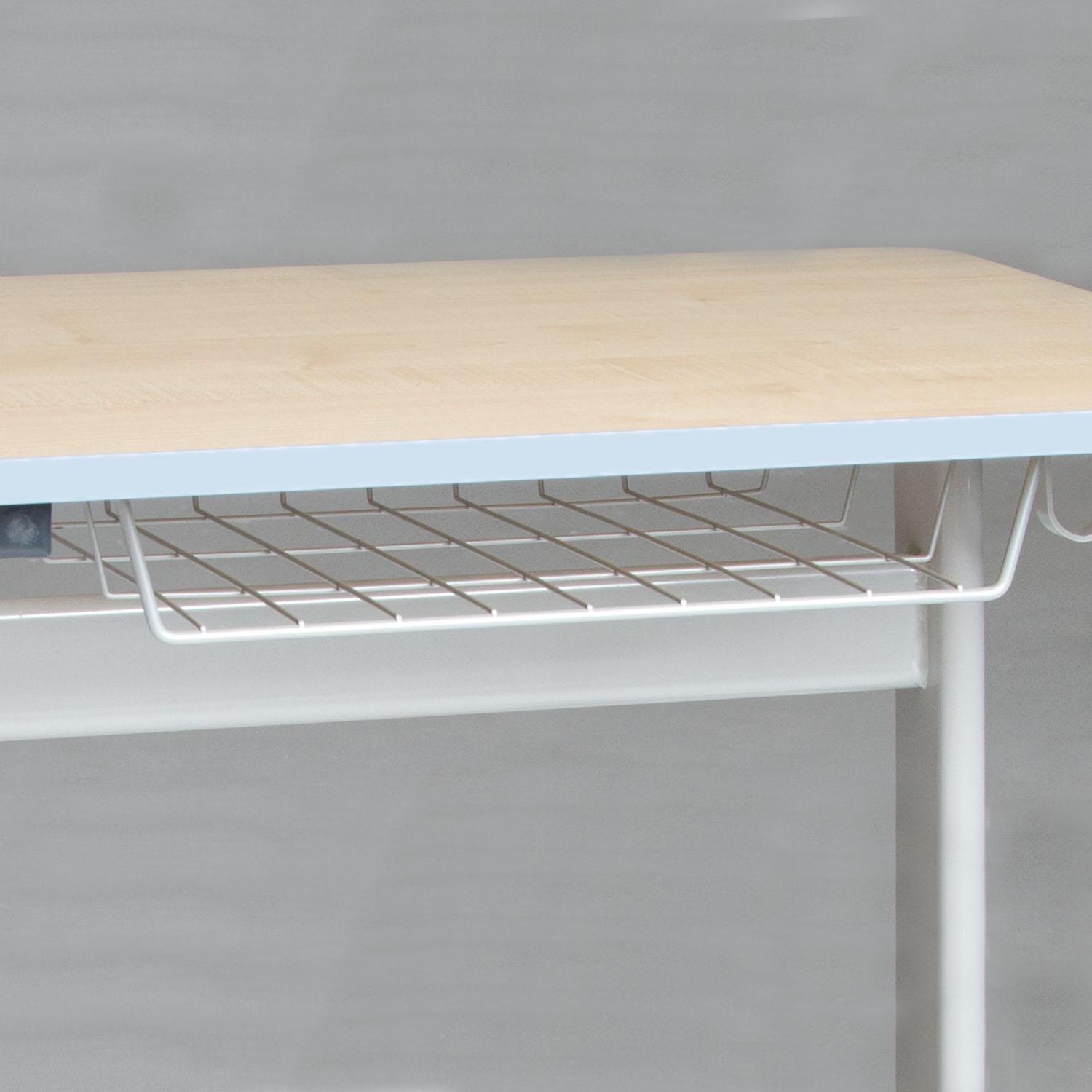 An einer Seite des Tischgestelles ist ein Mappenhaken angeschweißt, deren Kanten gerundet sind. Die Rohrenden sind geschlossen und mit gerundeten, recycelbaren ABS Kunststoffkappen versehen.