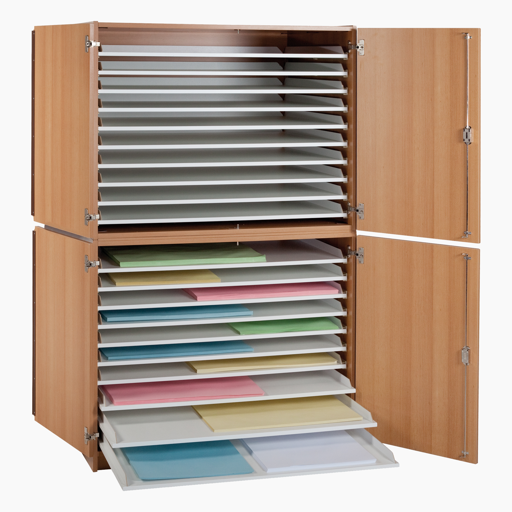 Die zweitürige Bildertruhe bietet durch 20 weiße Auszugböden Stauraum für Papierformate bis 100x70 cm.