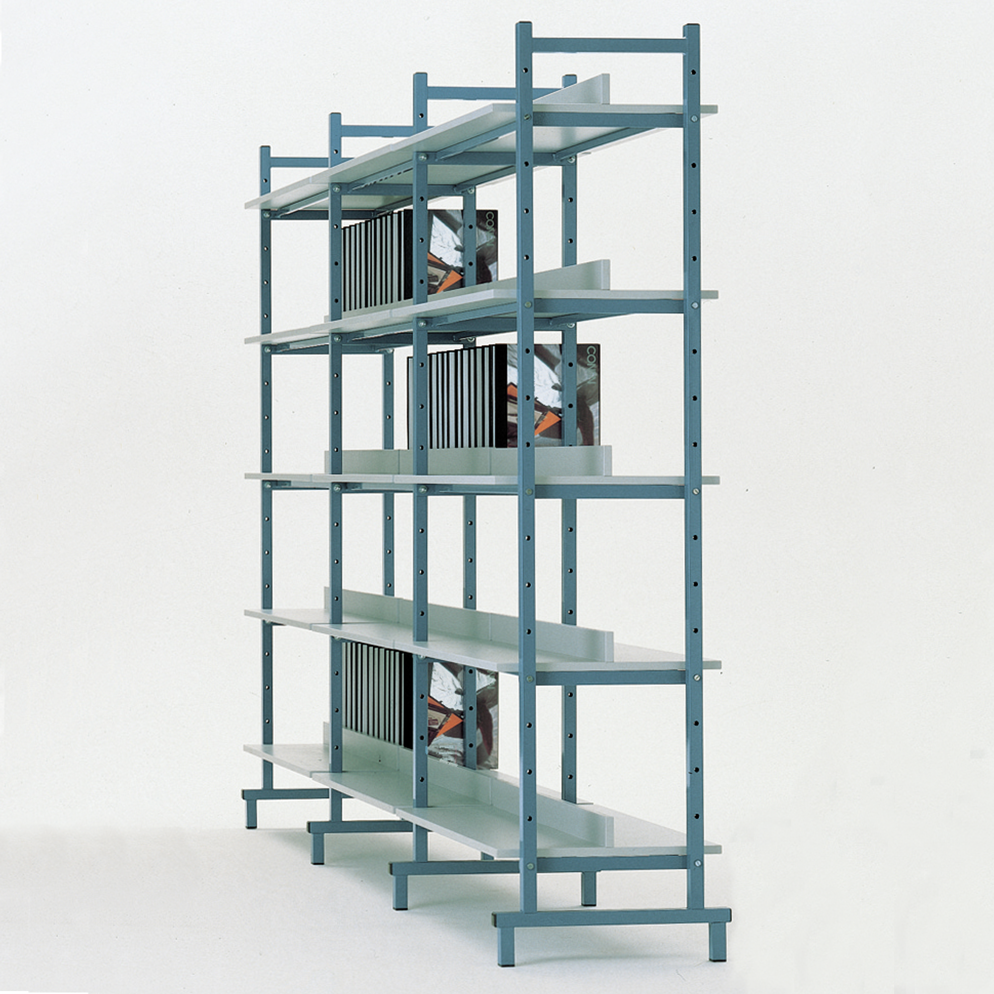 Bücherregal-Erweiterungselement doppelseitig freistehend, bestehend aus 5 Böden mit Stahlunterzug und 1 Seitenholm. Die Böden sind aus beidseitig melaminharzbeschichteten 19mm E1-Feinspanplatten.