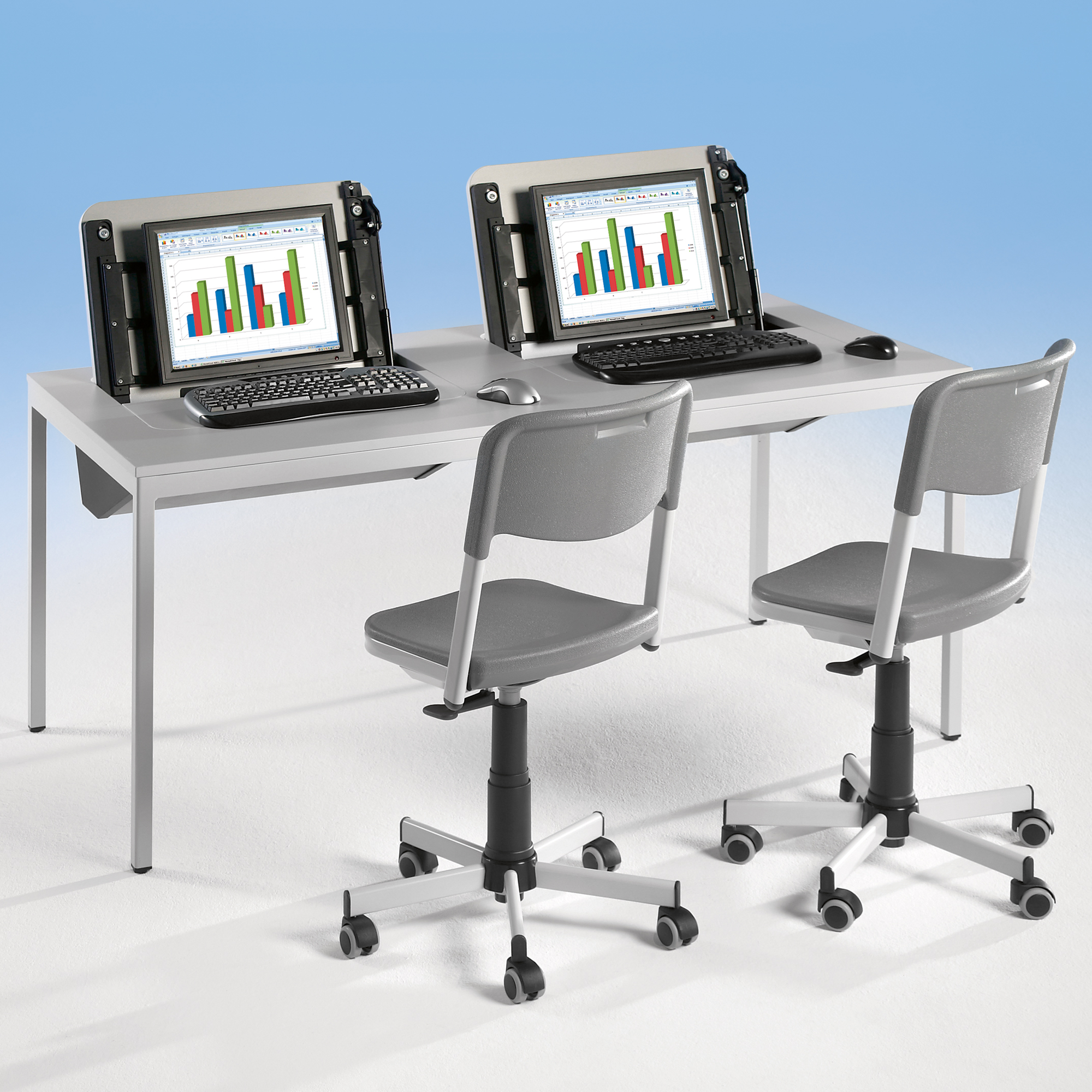 Das stabile 4-Fuß-Stahlrohrgestell mit 30x30 mm Profil und die 19 mm starke melaminharzbeschichtete Spanplatte mit ABS-Kanten bieten einen qualitativ hochwertigen Arbeitsplatz.