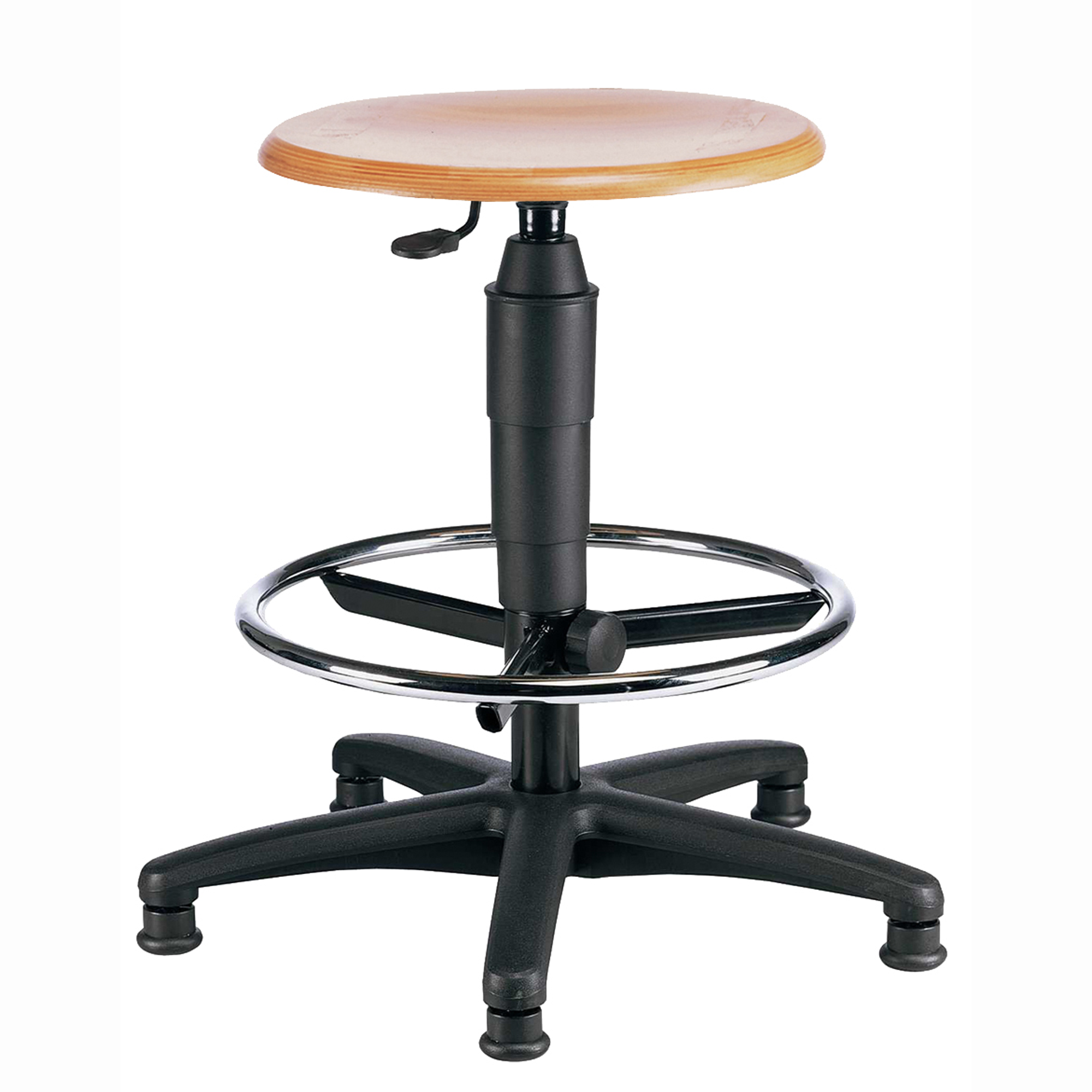 Unser Drehhocker mit stufenloser Sitzhöhenverstellung und Sicherheitsgasfeder, mit seinem formschönen und stabilen Kunststoff-Fußkreuz in schwarz, ist perfekt um schnell und einfach eine Sitzmöglichkeit zu schaffen. Zusätzlich mit verchromtem Fußring zum abstellen der Füße.