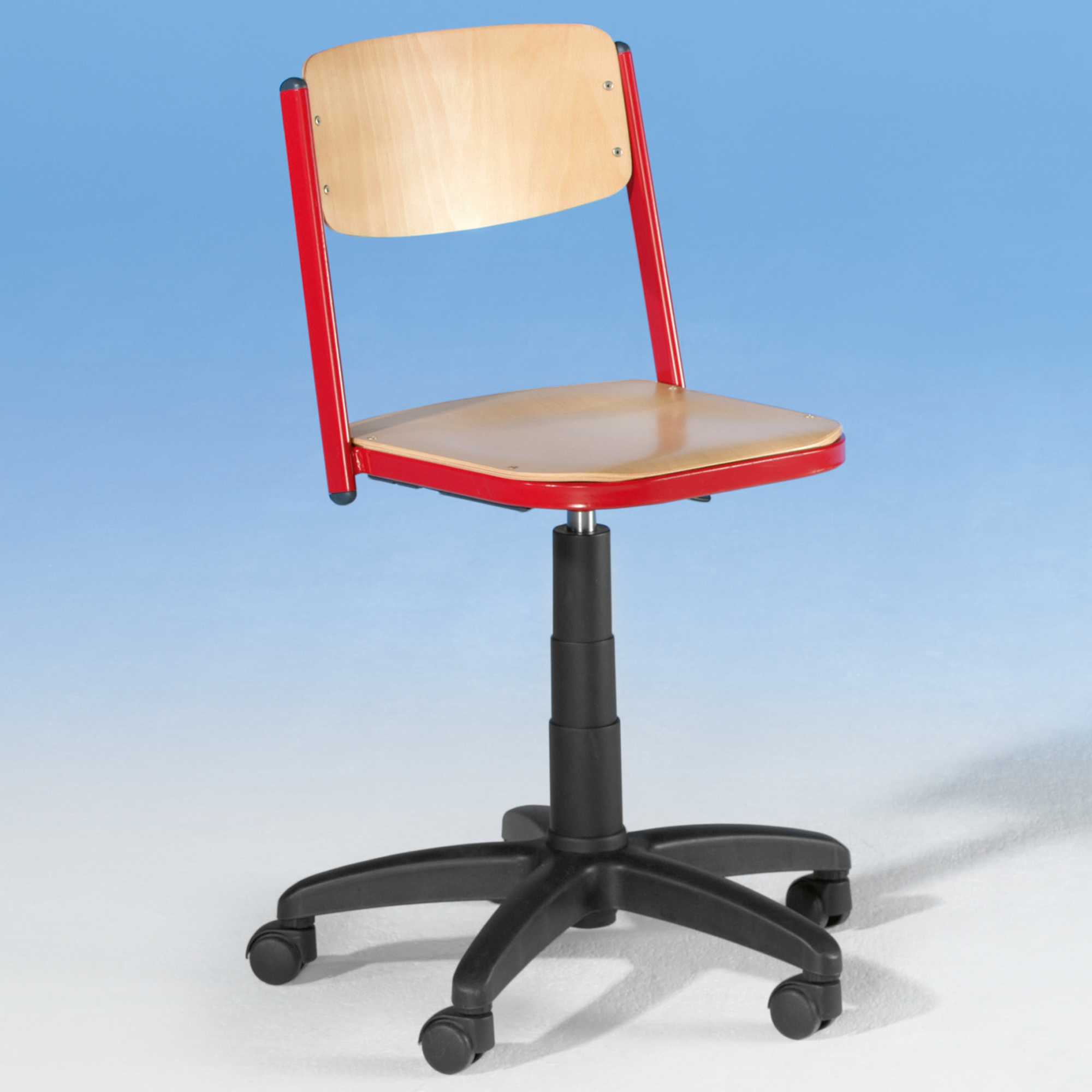 Unser Drehspindelstuhl ist durch die verdeckte Gewinde-Spindel höhenverstellbar von 50 bis 69 cm. Er steht auf einem Fünf-Fuß Gestell das mit Rollen versehen ist.