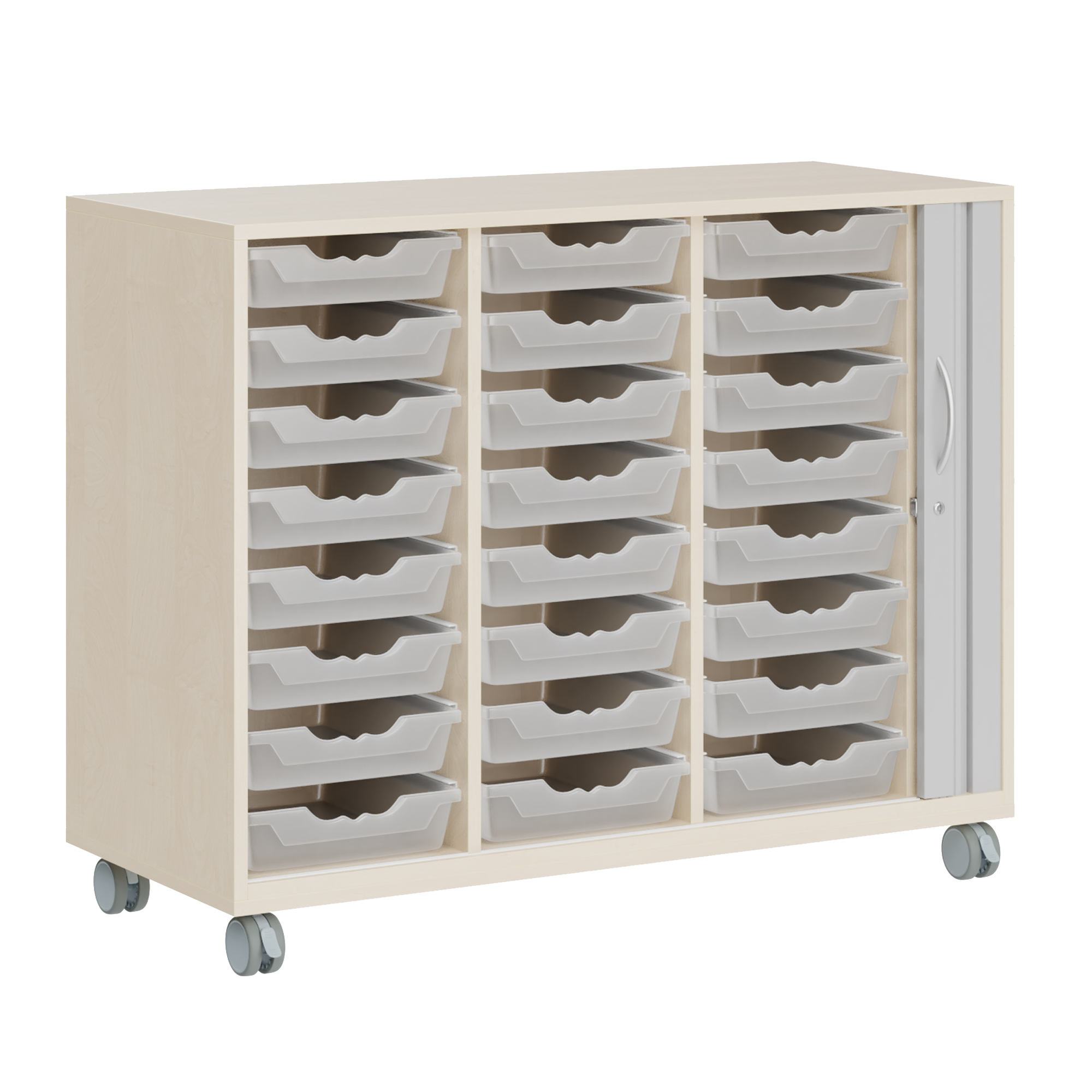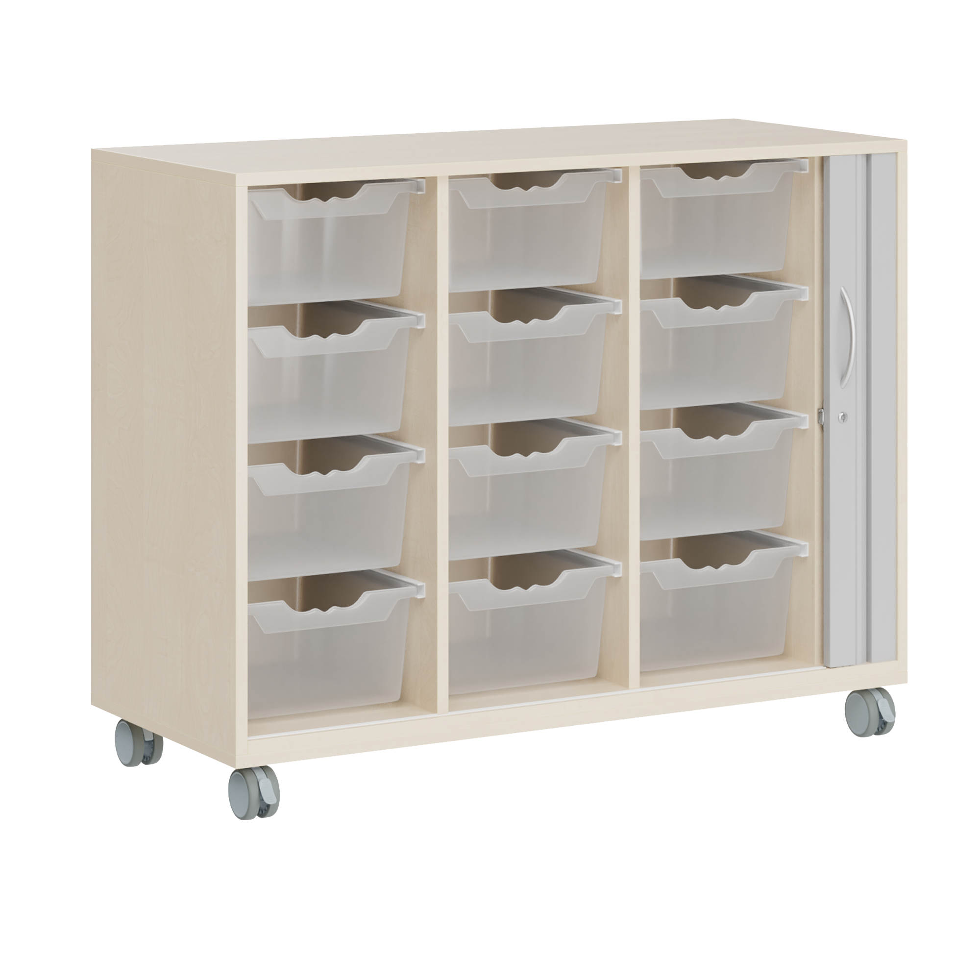 Das offene Sideboard mit praktischem Rollo, bietet dank seiner ErgoTray Boxen genug Stauraum für verschiedenes Material.